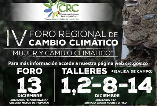 El evento, organizado por varias entidades del departamento, dará a conocer las políticas en pro de la población femenina y su rol en relación a la variablidad climática. La Corporación Autónoma Regional del Cauca, CRC; la Gobernación del Cauca, a través de la Secretaría de la Mujer; la Fundación ECOHABITATS, en articulación con el Nodo Regional de Cambio Climático Pacífico Sur, NRCCCPS; la Secretaría de Agricultura del Cauca mediante el Proyecto Suelos; el Programa de Cambio Climático, Agricultura y Seguridad Alimentaria, CCFAS; y el Centro Internacional de Agricultura Tropical, CIAT, realizarán este próximo 13 de diciembre de 2018, el IV Foro Regional de Cambio Climático, enfocado al papel de la mujer en los cambios que viene sufriendo el clima. (Lea: Cambio climático puede afectar reproducción del hato) El evento, en el marco de la gestión integral del cambio climático y el ajuste de la política de mujer, busca divulgar a nivel departamental los avances locales en políticas y gestión sobre variabilidad y cambio climático, en un contexto departamental de multiculturalidad, biodiversidad y posconflicto, con el propósito de fortalecer las redes y alianzas relacionadas con la adaptación, mitigación y conservación. Complementario al Foro, los días 8 y 14 de diciembre se realizan los siguientes talleres: 8 de diciembre: Elementos de asistencia técnica con enfoque de variabilidad climática en cultivos de frijol biofortificado y tolerante a la sequía. Facilitador: Ingeniero Carlos Jara, experto internacional. (Lea: Cambio climático amenaza disponibilidad de agua en Guatemala) 14 de diciembre: Metodología de Planes Prediales de Adaptación. Experto en adaptación variabilidad Climática Luis Alfonso Ortega Fundación Ecohabitats.