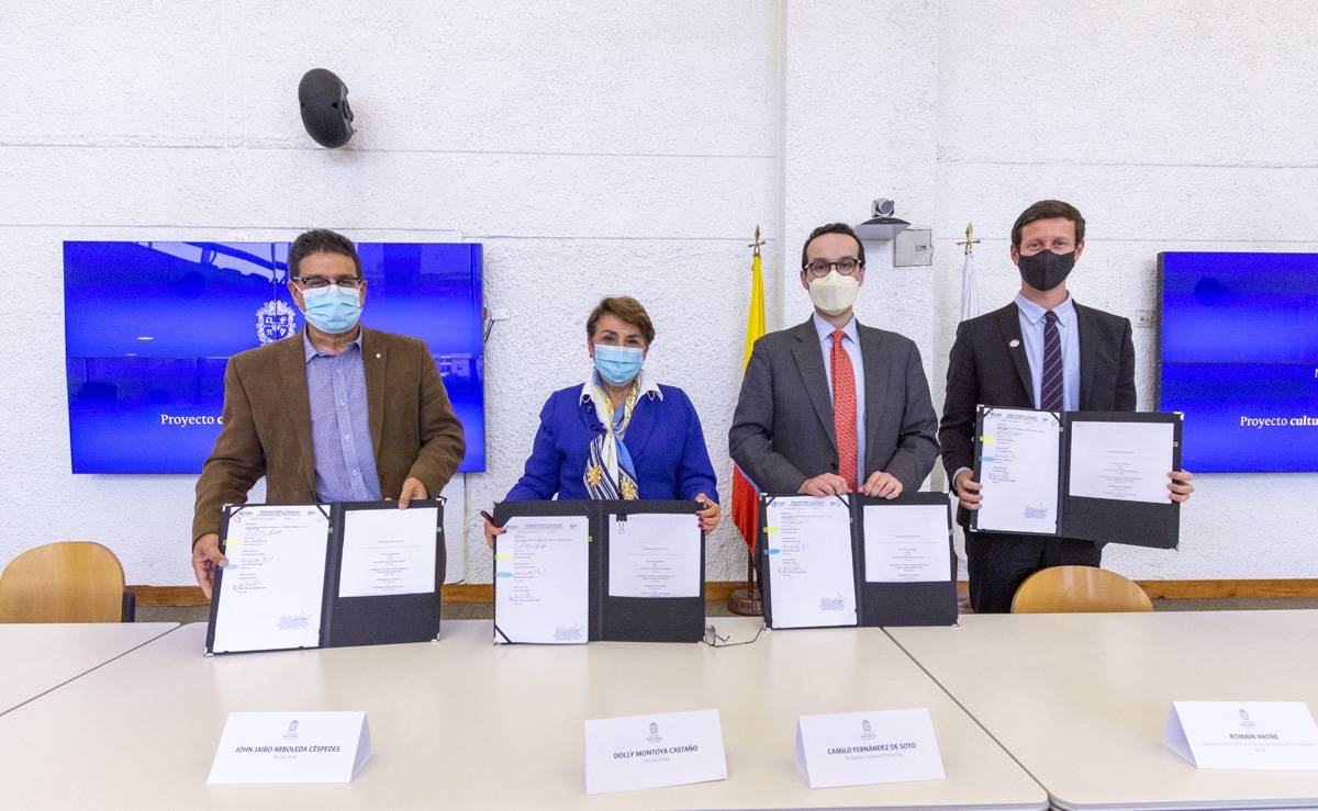 Representantes de cada una de las entidades protagonistas firmaron hoy en la Hemeroteca Nacional el acuerdo para construir un centro de eficiencia energética en predios de la UdeA, en el municipio de Carmen de Viboral (Antioquia).