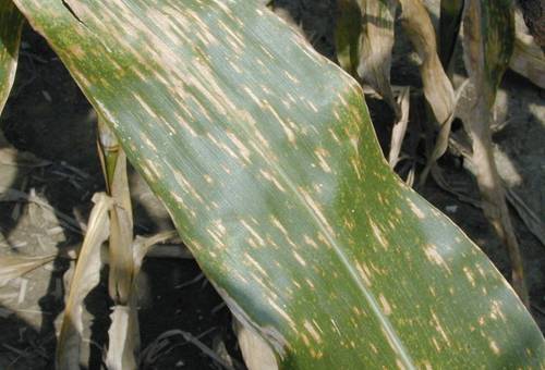 Mancha foliar por Septoria: Afecta principalmente el maíz en climas frescos húmedos. Los primeros síntomas aparecen como pequeñas manchas foliares de color verde claro o amarillo. Las lesiones se fusionan y causan un manchado intenso, así como necrosis de las áreas afectadas en las que se desarrollan estructuras oscuras productoras de esporas conocidas como picnidios.