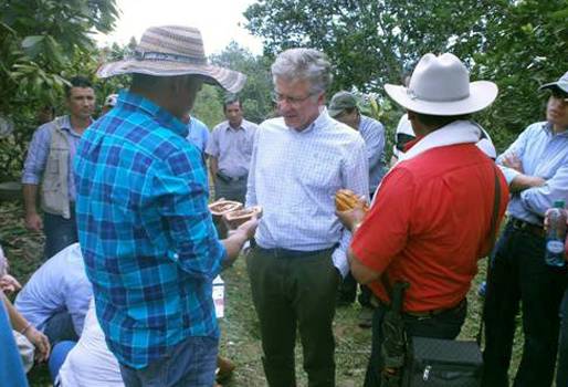 El funcionario dio a conocer la novedad ante un grupo de cacaocultores de Santander, donde miembros de la comisión de fomento cacaotero (2 del Ministerio de Agricultura y uno del Ministerio de Comercio, Industria y Turismo) realizaron una visita, invitados por la Federación Nacional de Cacaoteros, para conocer plantaciones modelo del cultivo.
