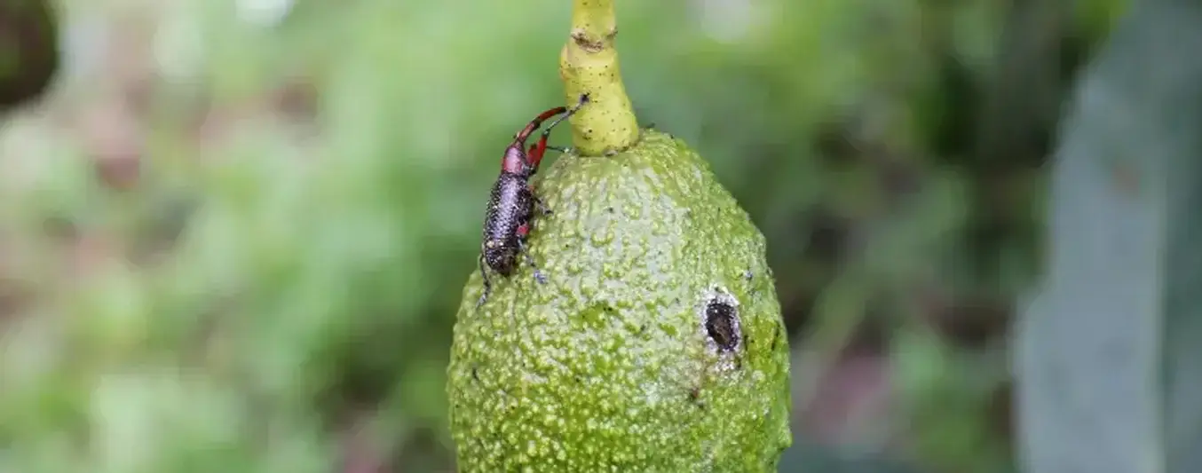 Heilipus lauri Boheman:Sus nombres comunes son picudo grande de la semilla de aguacate, perforador del fruto y la semilla de aguacate, pasador de fruto. De acuerdo a Agrosavia, “el desarrollo biológico del H lauri está estrechamente relacionado con la disponibilidad de frutos de aguacate.** La hembra hace orificios circulares sobre el fruto y posteriormente deposita el huevo en la perforación”.