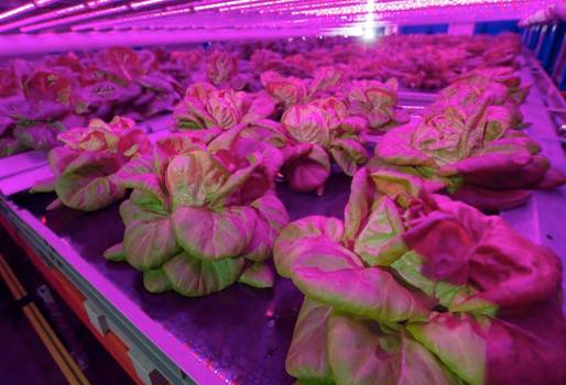 Un irreal halo de luz violácea baña decenas de lechugas dispuestas en estanterías de una granja vertical en el oeste de Bélgica, una futura solución para alimentar a la humanidad en climas hostiles y en momentos de pérdida de tierras cultivables.