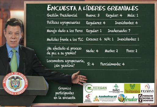 Ante la pregunta: ¿cómo califica la gestión de Juan Manuel Santos, luego de 3 años en el poder? 4 de los 8 representantes gremiales aseguraron que es muy regular, 3 manifestaron que es buena y solo un dirigente manifestó que es mala. Las respuestas dadas por los máximos representantes de la producción nacional, reflejan la desazón que ha dejado este mandato, ya que el agro ha sido uno de los más golpeados y relegados desde que Santos Calderón tomó las riendas del país.