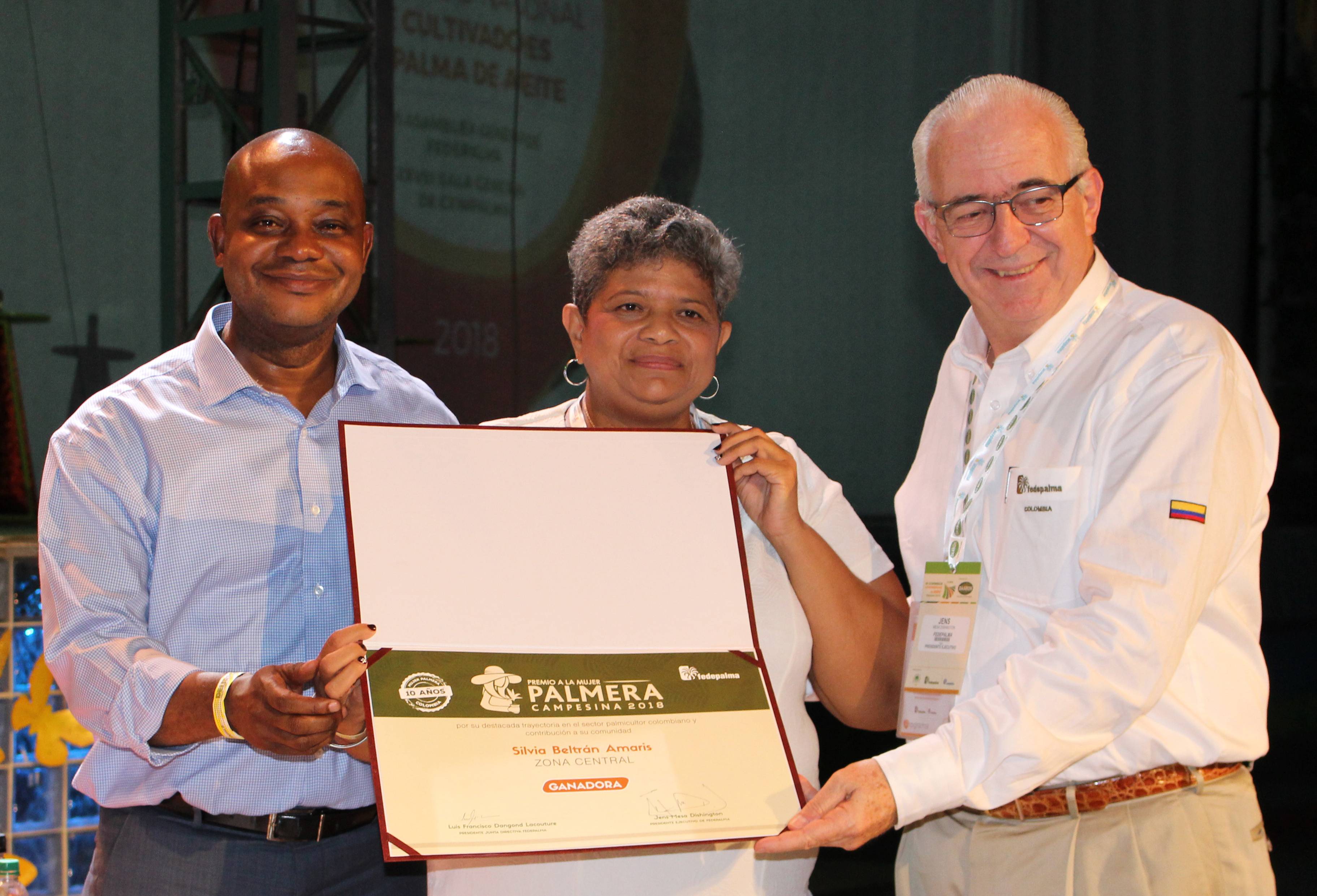 La entrega del premio, que tuvo lugar el pasado miércoles en Cali, fue parte del lanzamiento de la cuadragésima versión del Congreso Nacional de Cultivadores de Palma de Aceite, que empezó ayer en esta ciudad. Una mujer de Puerto Wilches fue elegida esta noche como la mujer palmera campesina 2018, título que otorga la Federación Colombiana de Palmicultores con el fin de reconocer la labor de las mujeres que han hecho de la palma de aceite su proyecto de vida y que con su empuje, dedicación y trabajo han contribuido al desarrollo y crecimiento de sus familias, de la comunidad palmera y de Colombia. (Lea: Abren postulaciones al Premio Mujer Palmera Campesina 2017) Silvia Beltrán manifiesta: “me siento satisfecha y feliz de trabajar por las personas más vulnerables de la región. Soy Mujer Palmicultora Social y por tal motivo conozco los beneficios de cultivar la palma de aceite, podrán haber formas distintas de extraer el aceite pero ninguna es tan valiosa como la palma ya que por medio de este producto le damos la oportunidad a otras personas de generar ingreso para el sostenimiento de sus hogares”. Silvia es madre cabeza de hogar, víctima del conflicto armado, oriunda de Puerto Wilches, Santander y está vinculada al sector agropecuario desde 1995. En su trayectoria ha desempeñado distintas labores, además de recibir capacitación para manejar el impacto del desplazamiento forzado en la niñez y trabajar en actividades de aplicación del proyecto de pedagogía y protección a la niñez en el Magdalena Medio. Adicionalmente ha adelantado estudios en Administración Pública con el SENA y formación en Gestión Comunitaria y Gerencia Social. En la actualidad se desempeña medio tiempo en la oficina de Asopepa y el otro con comunidades y específicamente trabaja con la Escuela para la Equidad de Género, Redmujeres Magdalena Medio. (Lea: La mujer palmera campesina 2016 es de Villanueva, Casanare) Silvia, desde su labor comunitaria, brinda apoyo y seguimiento a mujeres víctimas del conflicto armado y desplazadas por el mismo, respaldando los procesos de cada caso y brindando capacitaciones, asesoría jurídica y psicosocial con el fin de reconstruir el tejido social en su municipio. Finalistas seleccionadas Entre las finalistas se encuentra Idalia Ramírez Amaya de San Martín, Cesar. Es una mujer de 49 años de edad, madre cabeza de hogar, que ha consagrado su vida en el campo practicando diferentes actividades agronómicas. Los últimos 14 años los ha dedicado a todo lo que tiene que ver con el cultivo de palma de aceite, es por ello que su experiencia con la agroindustria, la inicia en la empresa ‘Palmas del Cesar’, en la que laboró durante seis años (2004 – 2010) en labores de siembra, sanidad y mantenimiento del cultivo. A partir del año 2012, con el ánimo de mejorar su calidad de vida y la de su familia, decide emprender, de forma independiente, su propia unidad productiva y de negocio, aprovecha las 5 hectáreas de sus predios para sembrar palma de aceite. Fue elegida por la comunidad del Barro para ocupar el cargo de presidenta de Junta de Acción Comunal durante 10 años, tiempo en el que gestionó y apalancó recursos y proyectos principalmente para la escuela de su comunidad. (Lea: Abren postulaciones al premio Mujer Palmera Campesina 2015) La otra finalista es María de La Cruz Mojica, quien es reconocida en la comunidad por su calidad de servicio y es actualmente la presidenta de la Junta de Acción Comunal del barrio El Centro, en donde ha sido gestora para su comunidad de obras como la pavimentación del barrio y lograr que la biblioteca municipal estuviera ubicada en su barrio y pertenezca a la mesa de víctimas del municipio. Además tiene una vocación cultural, ya que fue la presidenta del festival folclórico y de allí la vinculación de jóvenes, niños y adultos en esta actividad. Ella menciona: “Mi familia y yo somos el fruto del tiempo”. Hoy en día, gracias a su dedicación y empeño, su finca es ejemplo en la zona. Antecedentes del Concurso El Premio a la Mujer Palmera Campesina se entrega desde 2009 durante el Congreso Nacional de Cultivadores de Palma de Aceite, organizado por Fedepalma, a una de las mujeres que han sido postuladas por parte de las empresas palmeras y las asociaciones y cooperativas de productores de todo el país. Para otorgar el premio, en cada edición se reúne a un jurado reconocido ante la opinión pública que evalúa las cualidades personales, las labores específicas en el sector palmero y el trabajo y liderazgo comunitario realizado por las finalistas, quienes previamente han sido seleccionadas por un comité interno de Fedepalma con base en la documentación requerida en el reglamento. (Lea: Lanzan la 6ta versión del 'Premio a la Mujer Palmera Campesina)