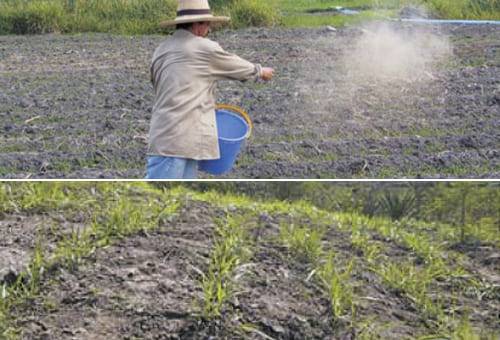De acuerdo con Álvaro Rincón y Samuel Caicedo, la siembra se realiza una vez esté preparado el suelo, utilizando una mezcla de los fertilizantes necesarios con las semillas de las especies recomendadas. No debe mezclarse con abono que contenga nitrógeno o potasio, y aún fósforo cuando es en forma de superfosfato.