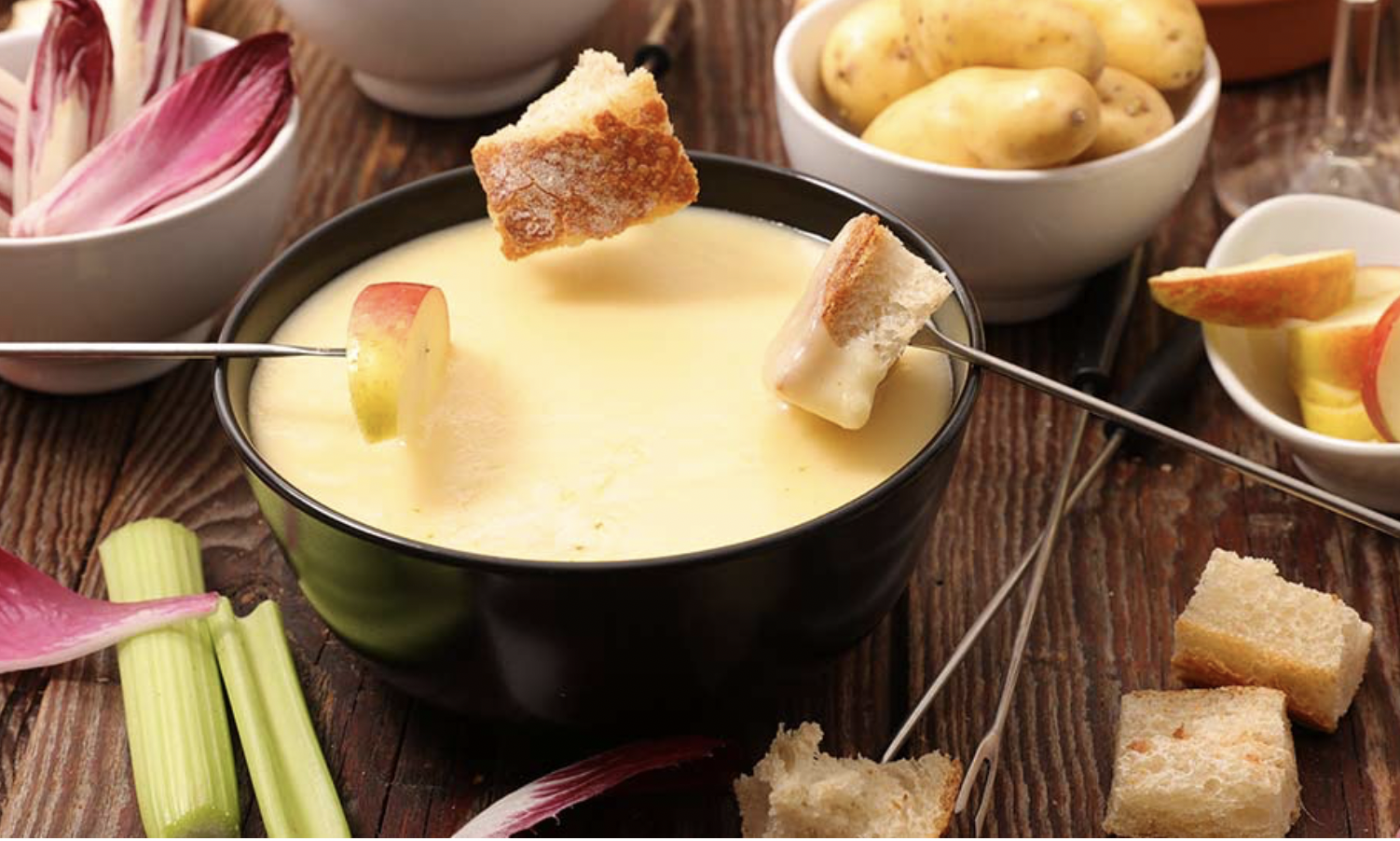 Y, para terminar, ¡Tendremos que explicar cómo se prepara! Aquí somos amantes del queso, por lo que vamos a preparar una buena ración por persona: 200 gramos de queso por comensal. Necesitamos que el queso esté rallado así que pídelo así o hazte con un buen rallador. Para darle un buen sabor, pasamos un diente de ajo por toda la cazuela y tras esto añadimos ya todo el queso… ¡y el vino! Una fondue siempre lleva vino blanco, y la proporción siempre debe ser el doble de queso que de vino. Una vez vertidos los ingredientes, lo removemos constantemente (pero no en círculos ya que crearemos una masa). Cuando esté todo fundido, añadimos la pimienta y la nuez moscada y… Voilà! Lo tenemos. Nota muy importante: el queso nunca tiene que llegar a hervir. ¡A disfrutar!