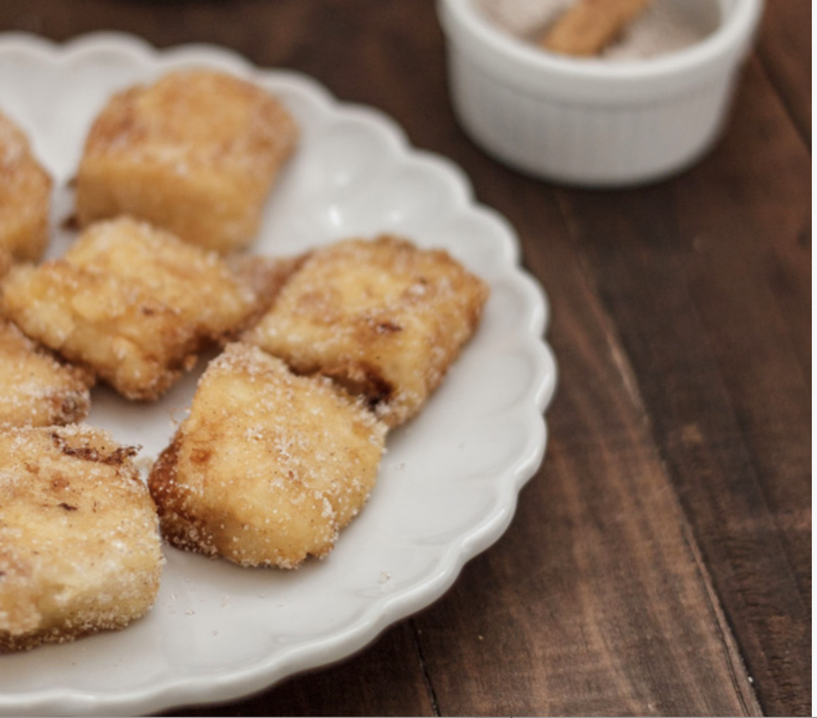 - En un plato mezclamos azúcar y canela en polvo, y rebozamos en él la leche frita.