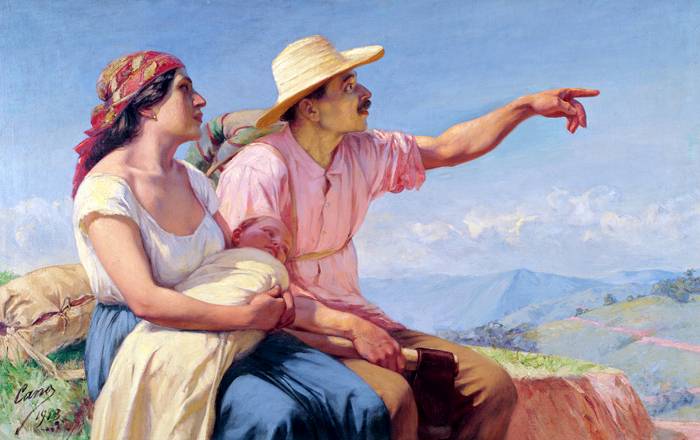“Nuestra vida la vamos a iniciar allá”. Supongo que eso es lo que el hombre le dice a su compañera al levantar el brazo izquierdo señalando un espacio verde. Ella, entre sus brazos, lleva el futuro del agro colombiano. Así es ‘Horizontes’, un óleo sobre tela de 95 centímetros de alto, por 150 de ancho, pintado por Francisco Antonio Cano en 1913.