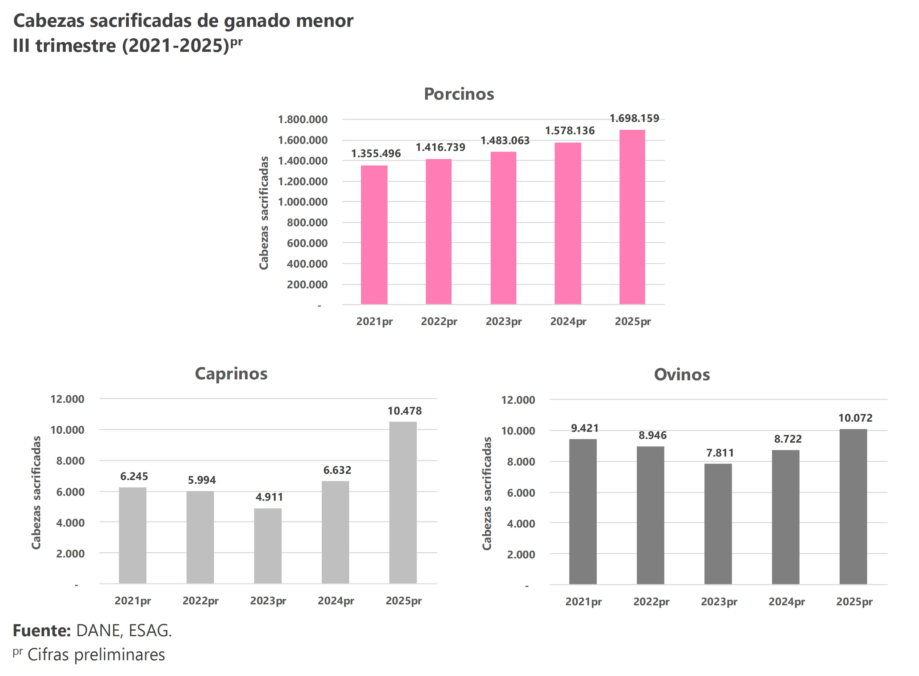 Solo en el trimestre de julio-septiembre, de la especie porcina se sacrificaron 1.698.159 cabezas, lo que representó un alza de 7,6 % con respecto a los mismos meses del año anterior. El sacrificio de machos se elevó 8,2 %, y el de las hembras, 6,4 %.