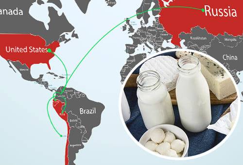 Así pues, este país adquirió 2075 toneladas de lácteos, 1075 de mantequilla y 1000 de leche en polvo entera, por un valor FOB total de USD 6 122 000. Le siguió EE. UU. con 1178 t por USD 5 851 000, con diversos productos como quesos, yogurt, mantequilla o leche líquida.