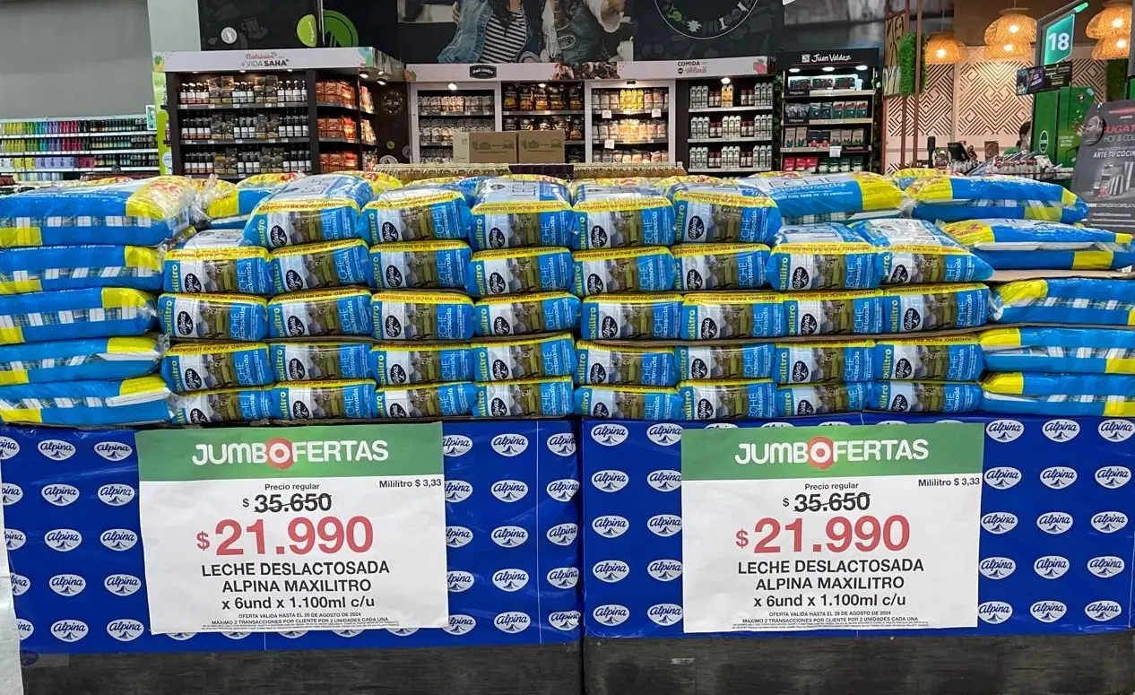 Se trata de Yumbo y Alpina que, como muestra la foto, bajaron el precio de la leche deslactosada en un ¡38.3 %! Aunque la ‘Yumbo oferta’ no se dio por un lapso prolongado, si evidencia que estos segmentos de la cadena láctea dan un paso adelante en la dirección de bajar los precios al consumidor para estimular el consumo, reducir inventarios de leche líquida y darle salida a la crisis lechera que aqueja a toda la cadena productiva.