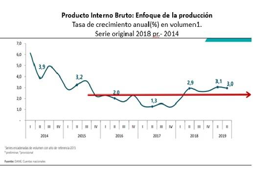 Por último, el DANE informó que en el periodo abril-junio de 2019, el PIB en su serie original creció 3 % respecto al mismo periodo de 2018. En similar lapso de 2018 la variación fue 2,9 %; un año atrás había sido de 1,3 %; y en 2016 quedó en 2 %.