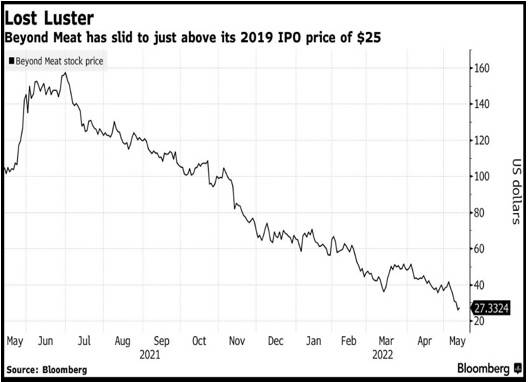 A su vez el análisis deja un respiro a Beyond Meat al señalar que si bien las ventas en EE. UU. superaron las expectativas, las ventas internacionales fallaron. El precio de su acción se ha deslizado justo por encima de salida a bolsa de 2019 de $ 25 (Ver gráfica)