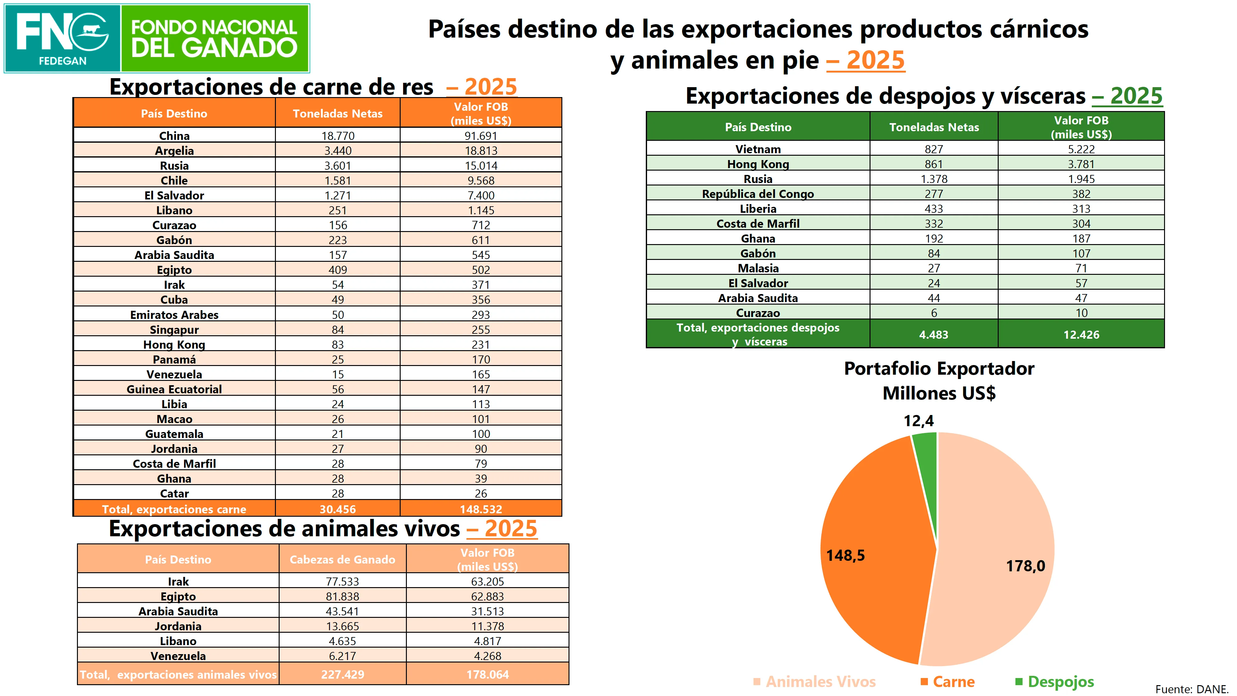 - Animales vivos: en 2025 se llevaron al exterior un total de 227.429 animales por un valor de 178 millones de dólares. Los mercados más importantes fueron Irak (77.533 bovinos por USD 63,2 millones), Egipto (81.838 semovientes, USD 62,8 millones) y Arabia Saudita (43.541 animales, USD 31,5 millones).