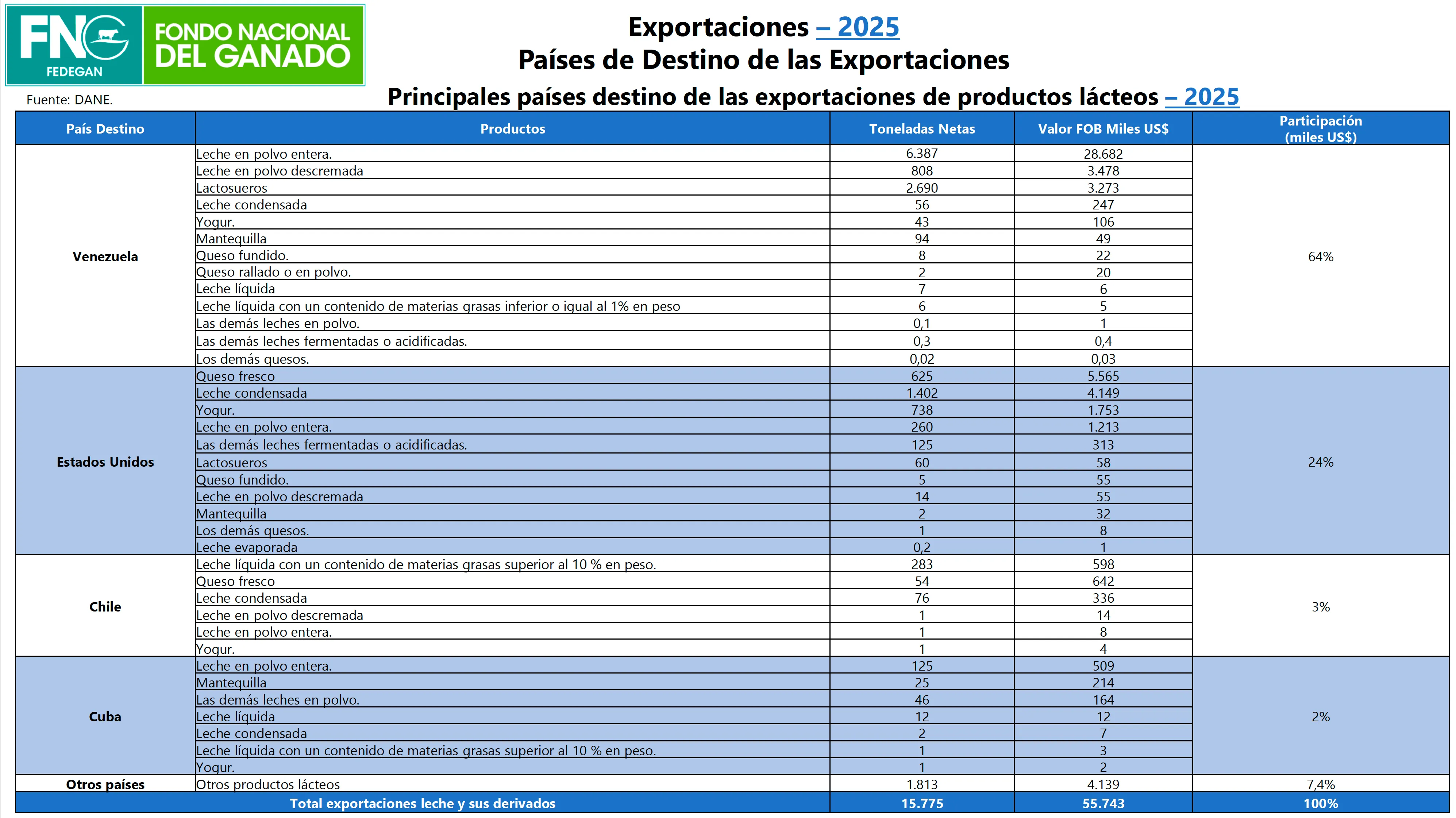 “Venezuela es el principal destino de las exportaciones de leche y derivados lácteos. El año pasado llegó a ese país el 64 % de las ventas internacionales del sector (USD 35,8 millones). Los principales productos lácteos que llegaron a ese mercado fueron leche en polvo entera, leche en polvo descremada y lactosueros”, añadió.