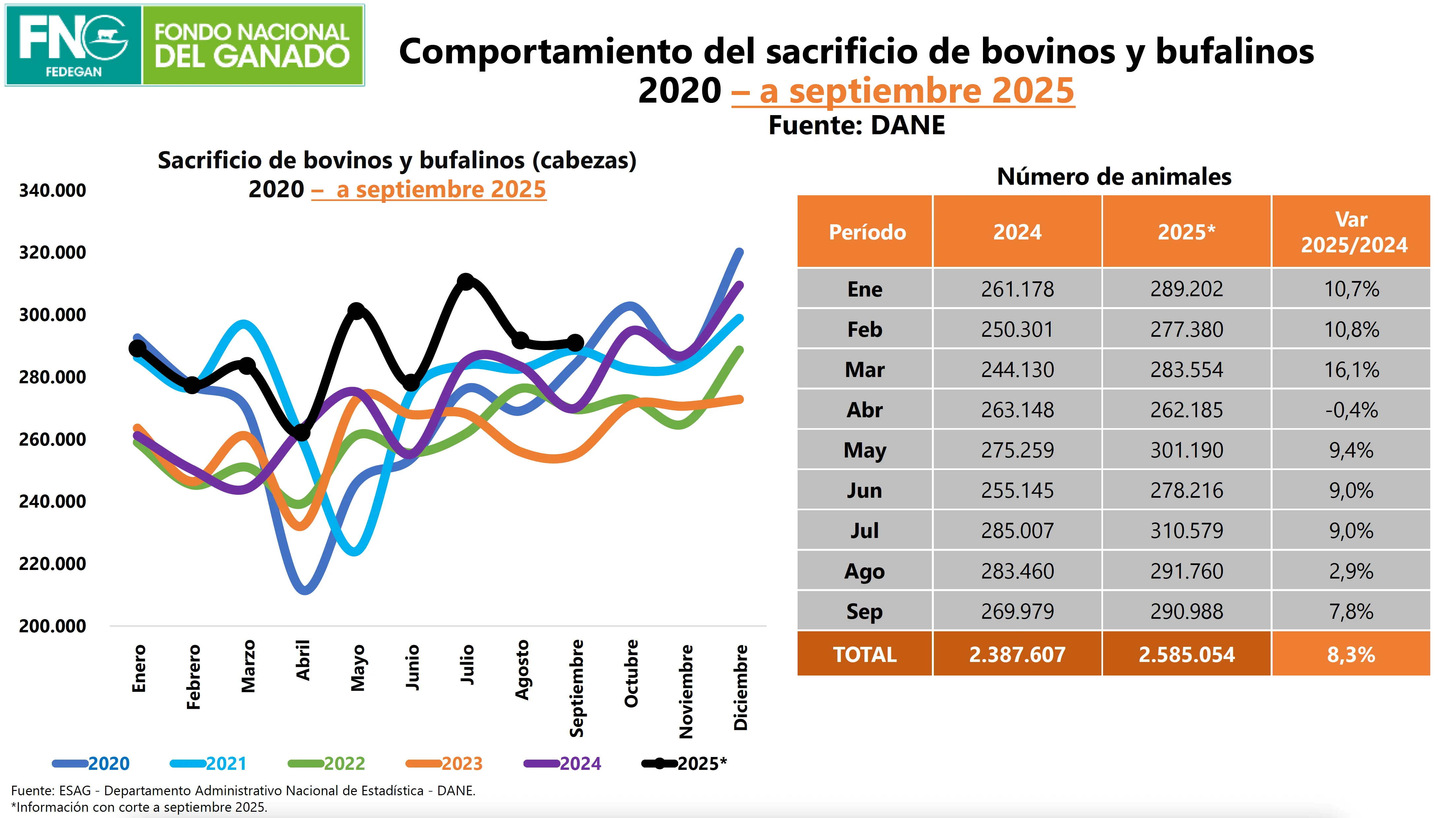 Según la Encuesta de Sacrificio de Ganado (ESAG) del Departamento Administrativo Nacional de Estadística (DANE), entre enero y septiembre se beneficiaron formalmente 2.542.117 bovinos, un 8,3 % más que en el mismo lapso de 2024 (2.347.899 animales), lo que representa 194.218 cabezas adicionales.