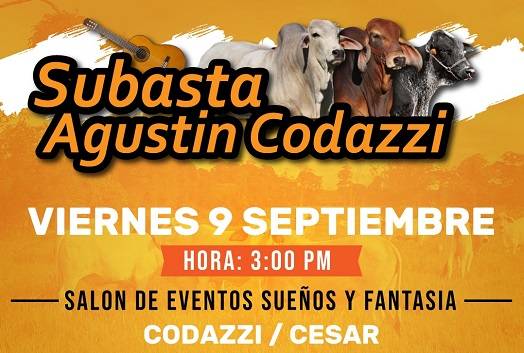 El próximo 9 de septiembre se llevará a cabo una nueva subasta ganadera de TVGAN, como parte del proyecto TVGAN por Colombia, en esta oportunidad de tipo semi presencial, en Codazzi (Cesar). El evento se llevará a cabo a partir de las 3:00 p. m. en el salón de eventos Sueños y Fantasías de Codazzi.