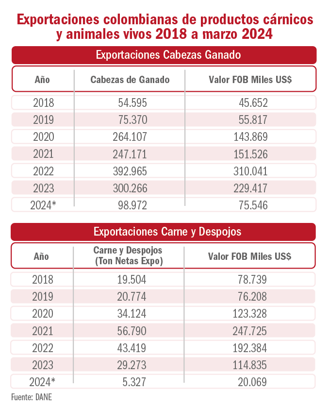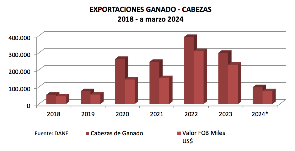 Durante el primer trimestre de 2024, Colombia exportó un total de 98.972 cabezas de ganado, lo que representa un aumento del 47,1 % en comparación con el mismo período de 2023, cuando se exportaron 67.263 cabezas.