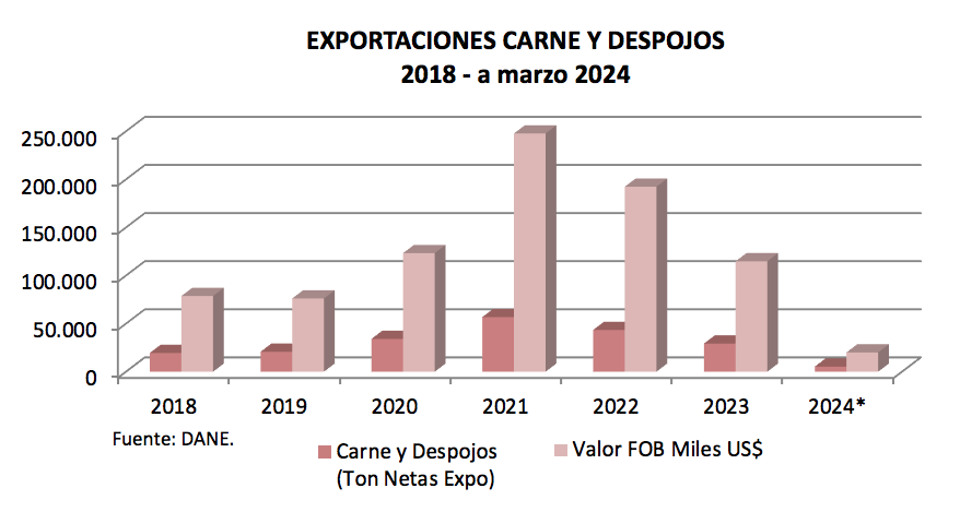 Las exportaciones colombianas de ganado en pie y carne mostraron un comportamiento mixto en el primer trimestre de 2024, en comparación con los mismos períodos de años anteriores. Mientras que las exportaciones de ganado en pie experimentaron un repunte significativo, las exportaciones de carne y despojos presentaron una disminución.
