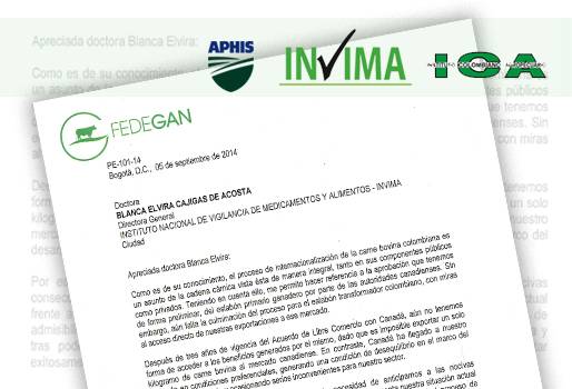 El Instituto Nacional de Vigilancia de Medicamentos y Alimentos, Invima; el Instituto Colombiano Agropecuario, ICA; y el Servicio de Inspección de Sanidad Agropecuaria, APHIS (por sus siglas en ingles); fueron las entidades receptoras de sendas cartas en las que se reafirma la prioridad que se le debe dar a este tema buscando que elsector cárnico del país logre aprovechar los Tratados de Libre Comercio firmados con Estados Unidos y Canadá. (Lea: Araucanos incumplen trámites para exportar ganado)