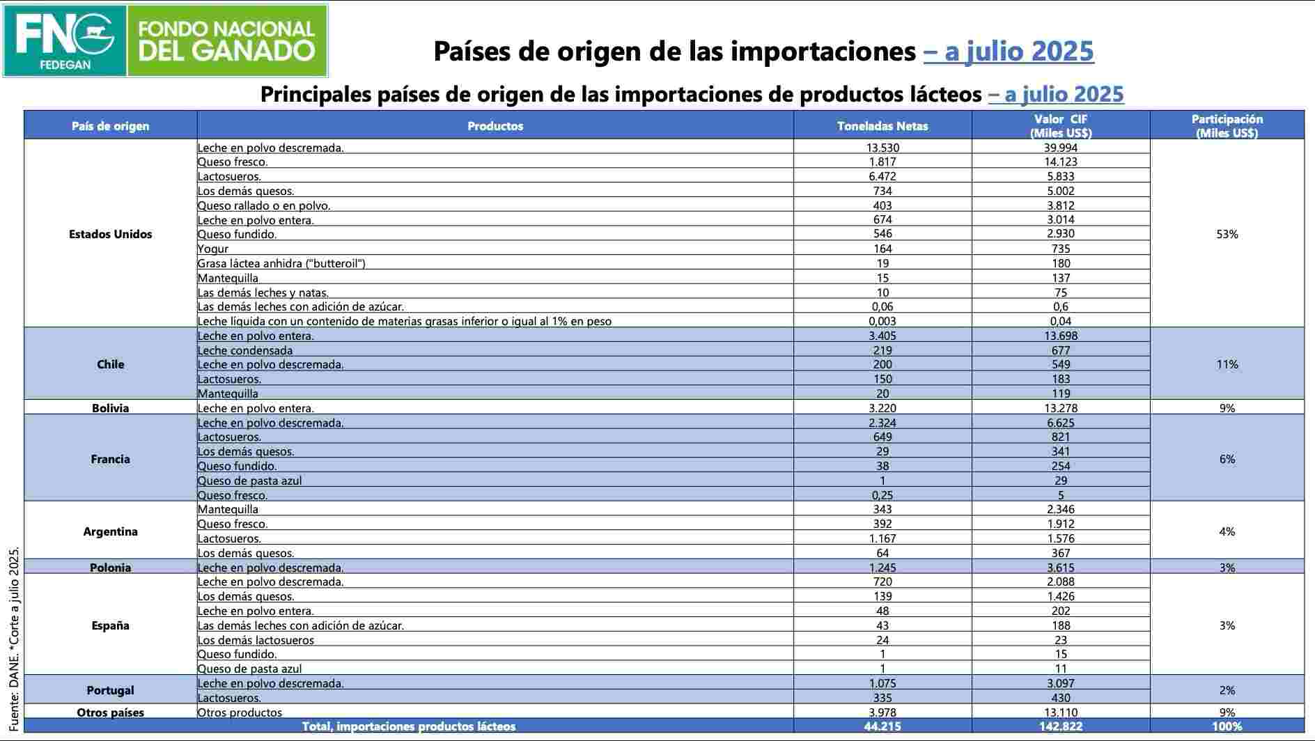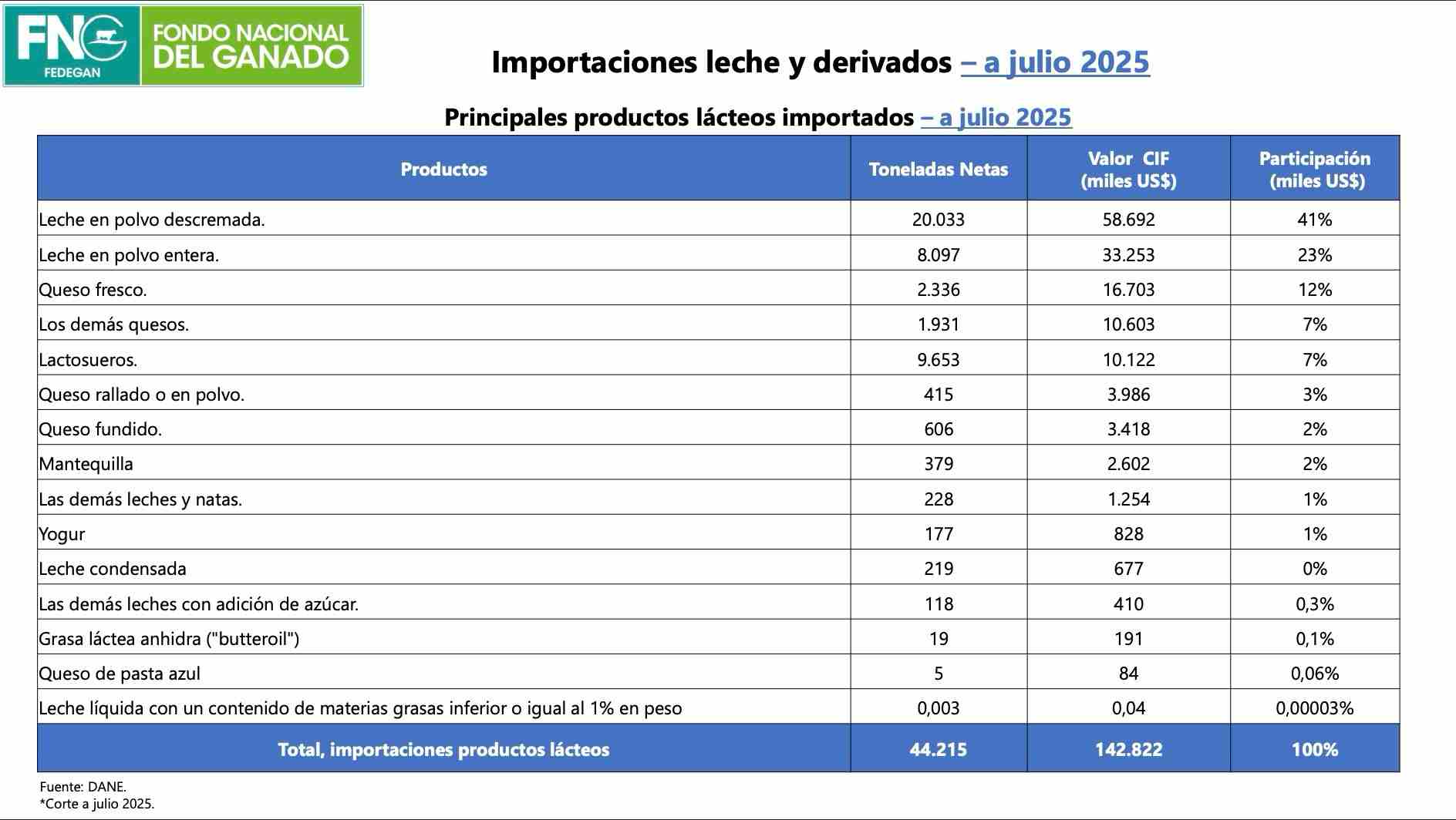 El incremento de importaciones hasta julio de 2025 plantea un panorama complejo para la ganadería colombiana. A la presión de precios bajos al productor se suma el ingreso masivo de leche en polvo y derivados.