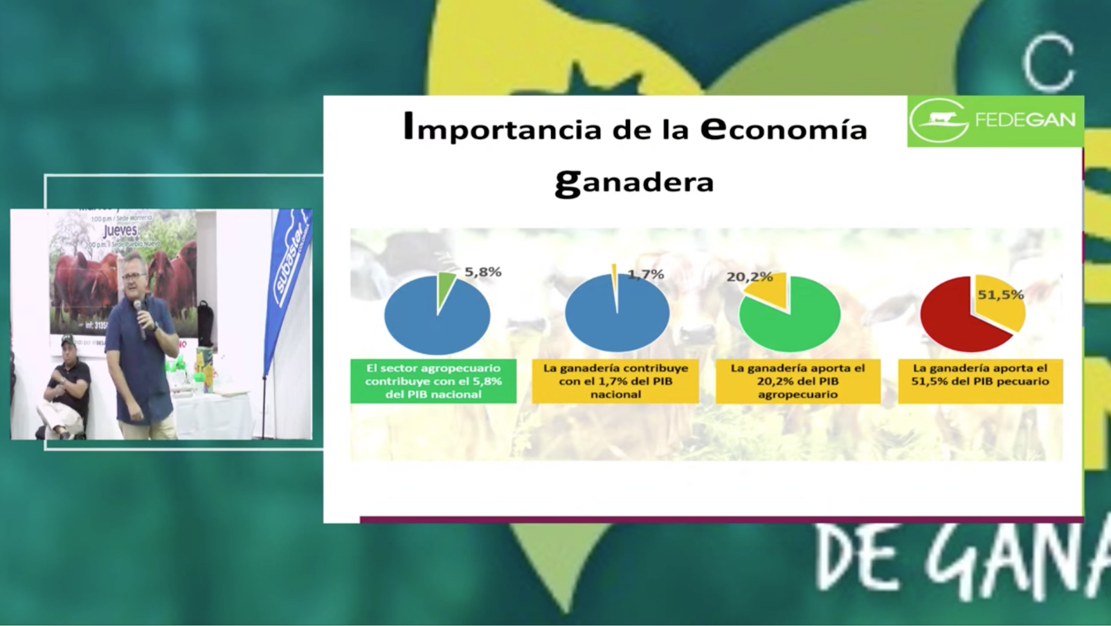 Así lo indicó Augusto Beltrán Segrera, secretario técnico del Fondo de Estabilización de Precios, en una charla durante el Primer Seminario Internacional de Ganadería y Medio Ambiente, donde señaló que la ganadería aporta mucho más a la economía nacional que el café o las flores u otros renglones de la economía agrícola del país. Contribuye con el 1,7 % del PIB nacional, aporta el 20,2 % del PIB agropecuario y el 51,5 % del PIB pecuario.
