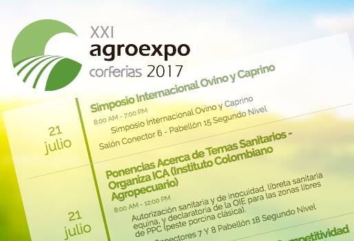 El campo en Bogotá se le dice a Agroexpo, que este año celebra su versión XXI y tiene la siguiente agenda para hoy viernes 21 de julio de 2017. Ganado ovino y caprino De 8:30 a.m. a 7:00 p.m. Simposio internacional ovino y caprino. Organiza: Ministerio de Agricultura. Lugar: Salón conector 6 pabellón 15 segundo nivel. Libreta sanitaria equina 8:00 a.m. a 12:00 pm Autorización sanitaria y de inocuidad. Libreta sanitaria equina y declaratoria de la OIE para las zonas libres de PPC. Organiza: ICA Lugar: Salones conectores 7 y 8 pabellón 18, segundo nivel. Reproducción bovina 8:30 a.m. a 4.30 p.m. Seminario de actualización en reproducción bovina. Organiza: Criyogen Colombia. Lugar: Auditorio de Corferias. Seminarios Apiarios El Pinar 10.00 a.m. a 12.00 p.m. Lugar: salones conectores 4 y 5 pabellón 15 segundo nivel. La raza Blonde D Aquitaine 10.00 a.m. a 12.00 p.m. Charla sobre la raza Blonde D Aquitaine. Lugar: Salón conector 3 pabellón 11 segundo nivel. Foro Instrumentos de competitividad estratégica y territorial. 2.00 p.m. a 6.00 p.m. Organiza: La Unión Europea. Lugar: salones conectores 1 al 3 pabellón 11, segundo nivel. Cómo mejorar la eficiencia de la producción lechera 2.00 p.m. a 3.30 p.m. Organiza: Elanco Animal Health Lugar: salones conectores 4 y 5 pabellón 15 segundo nivel. Contratos Agropecuarios 2.30 p.m. a 4.00 p.m. Organiza: UPRA Lugar: salones conectores 7 al 9 pabellón 18 segundo nivel. Pequeña propiedad productiva 6.00 p.m. a 8.00 p.m. Pequeña propiedad productiva y sustentable. Organiza: Semprecol. Lugar: salones conectores 4 y 5 pabellón 15 segundo nivel.