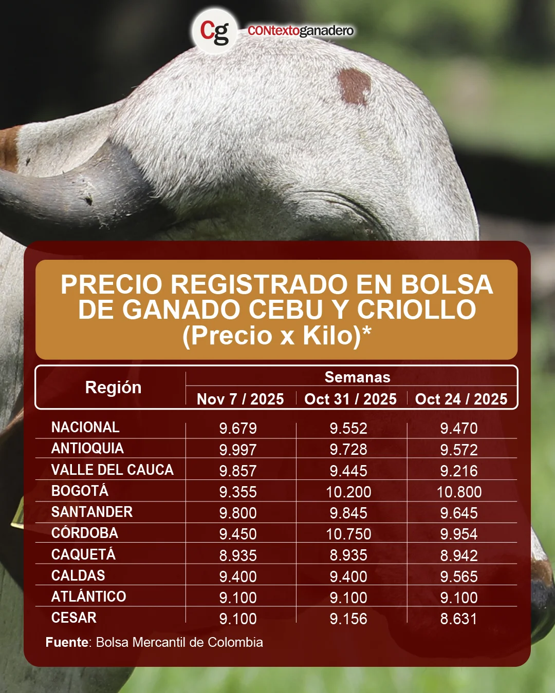En el más reciente reporte de la Bolsa Mercantil de Colombia sobre los precios del ganado gordo comercial, Antioquia se ubicó en la primera casilla con un promedio de $9.997/kg, aunque esta cifra fue $753 menor que la del líder de la semana anterior.