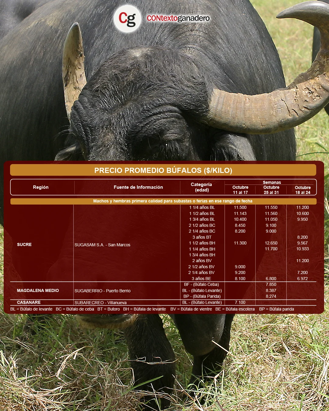 No obstante, en Sugasam se siguen presentando los mayores valores: el BL de 1 ¼ años llegó a $11.500/kg, seguido de la búfala de levante (BH) de 1 ½ años con $11.300/kg y cierra el BL de 1 ½ años con $11.143/kg.