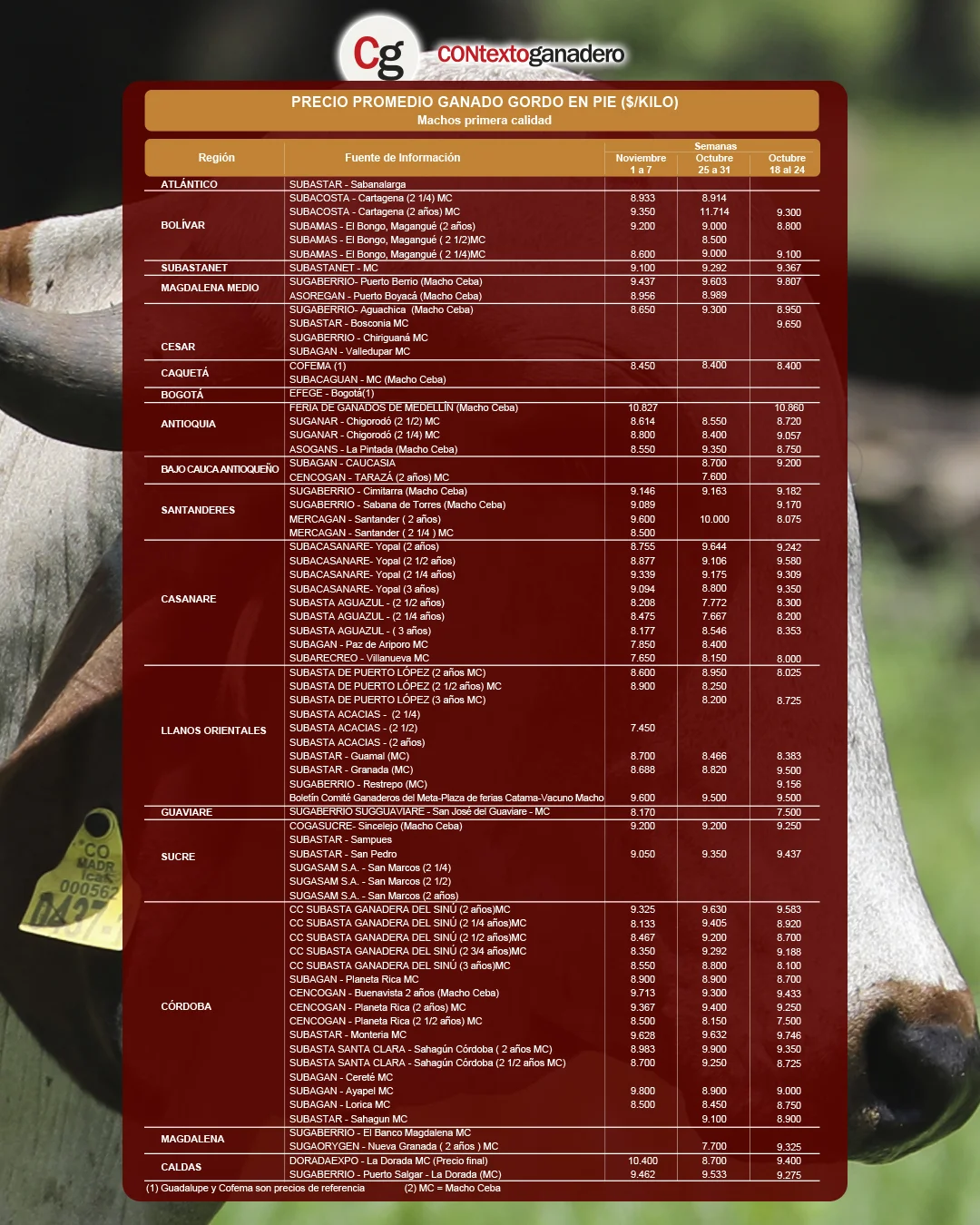 La segunda casilla fue para el valor de macho cebado (MC) en la comercializadora Doradaexpo en La Dorada (Caldas), que se ubicó en $10.400/kg. También fue la plaza con el mayor incremento semanal, de 19,5 % (equivalente a $1.700).