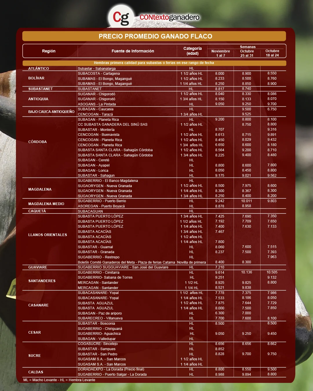 A continuación, CONtexto ganadero presenta las principales novedades del precio del ganado en subastas de la semana del 1 al 7 de noviembre, con base en los datos recopilados por la Oficina de Planeación y Estudios Económicos de la Federación Colombiana de Ganaderos y el Fondo Nacional del Ganado (Fedegán-FNG).