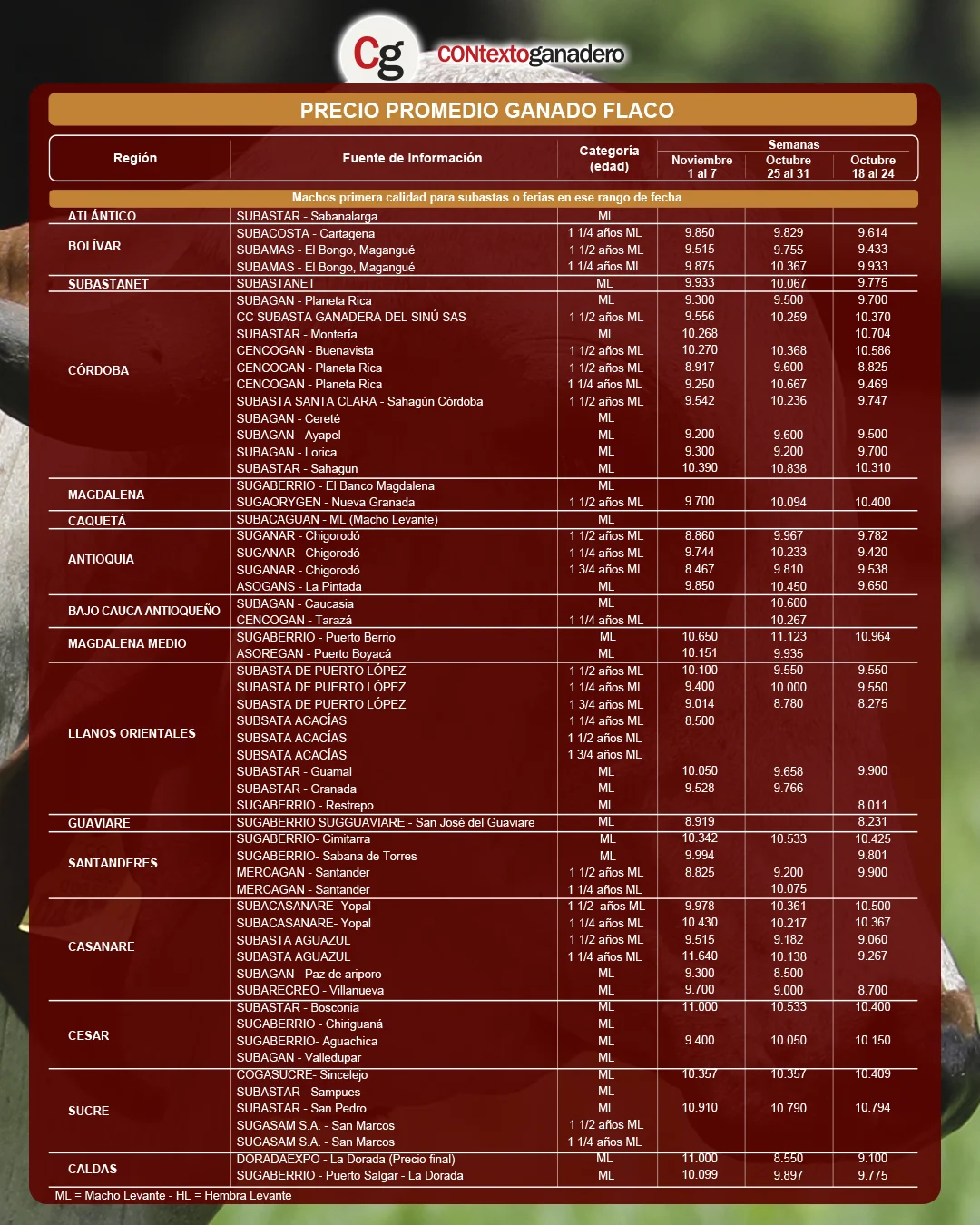 En la primera semana de noviembre la Feria de Ganados de Medellín retomó el primer lugar del podio en el precio de macho gordo, con un valor promedio de $10.827/kg, $887 menos que el primero del informe anterior.