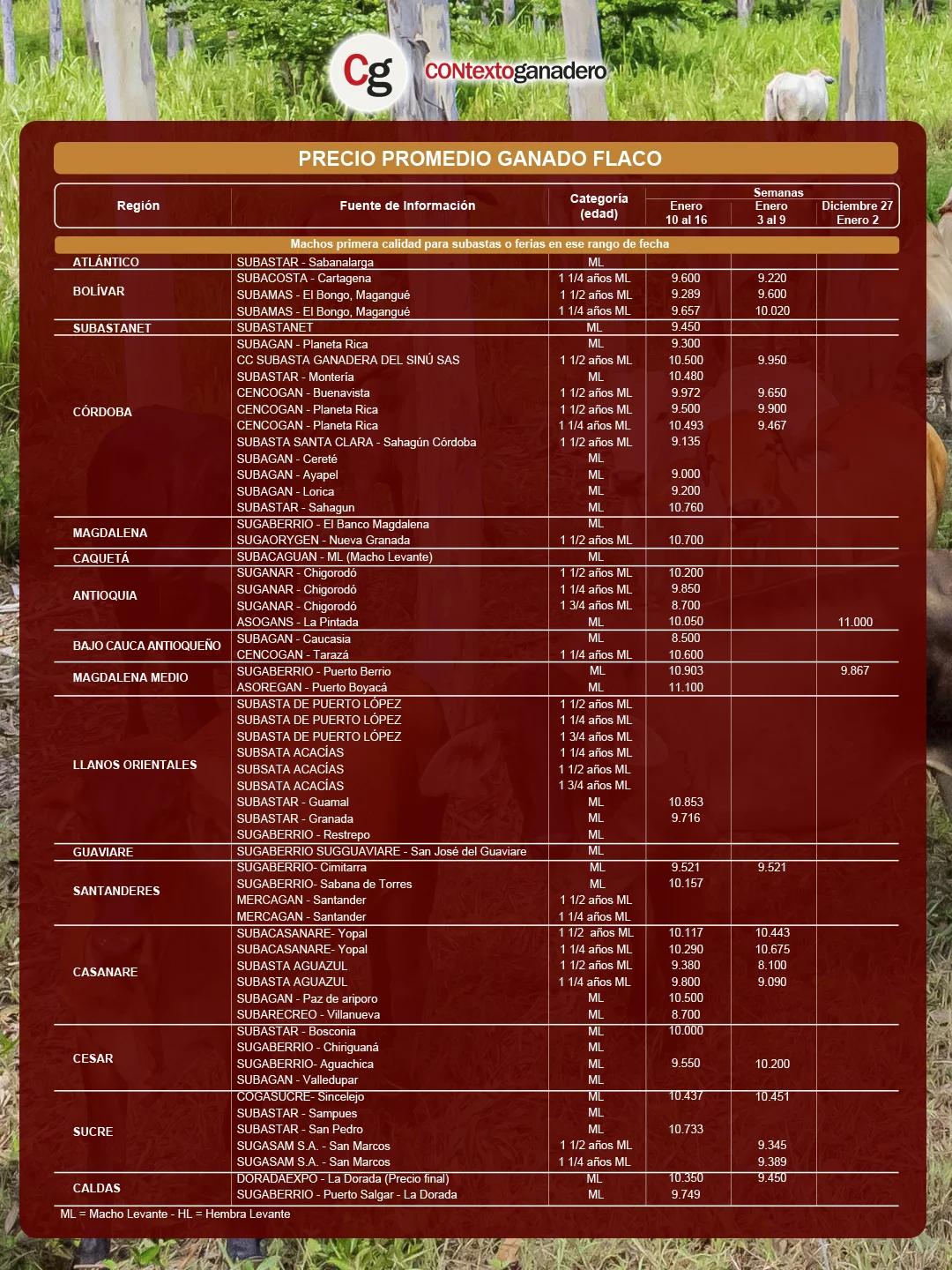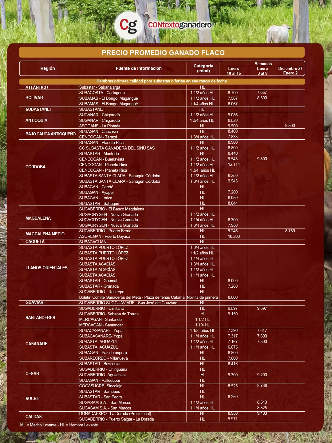 Cencogán de Planeta Rica también lideró el precio de la hembra flaca o de levante de primera calidad (HL): la HL de 1 ½ años abrió el año en $12.114/kg, un desempeño destacado para este segmento y el más alto entre las diferentes categorías de ganado.