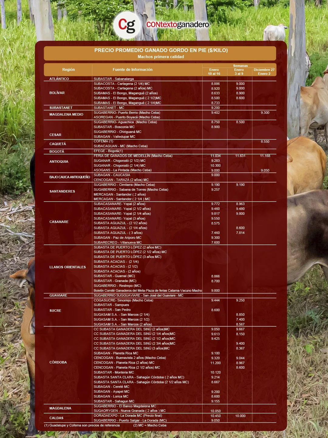 No obstante, en el reporte más reciente, correspondiente al periodo del 10 al 16 de enero, el primer lugar pasó a Cencogán en Planeta Rica (Córdoba), donde el MC de 2 años alcanzó $11.200/kg, mientras que la plaza antioqueña descendió al segundo puesto con $11.034/kg.