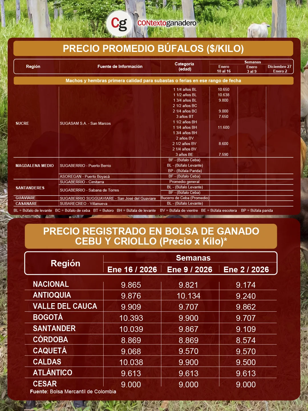 Al comenzar el 2026, la subasta de búfalos de Sugasam en San Marcos (Sucre) reveló que el precio más alto fue el de la búfala de levante (BH) con $11.300/kg, seguido del búfalo de levante (BL) de 1 ¼ años con $10.650/kg y de 1 ½ años con $10.638/kg.