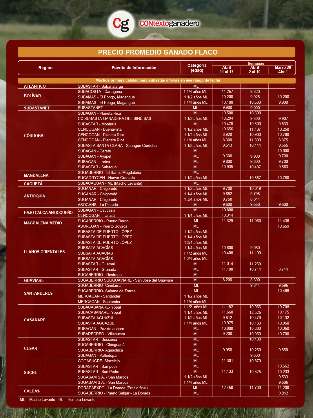 A continuación, Contexto presenta las principales novedades del precio del ganado en subastas correspondientes al periodo del 13 al 19 de abril de 2026, con base en cifras de Fedegán-FNG.
