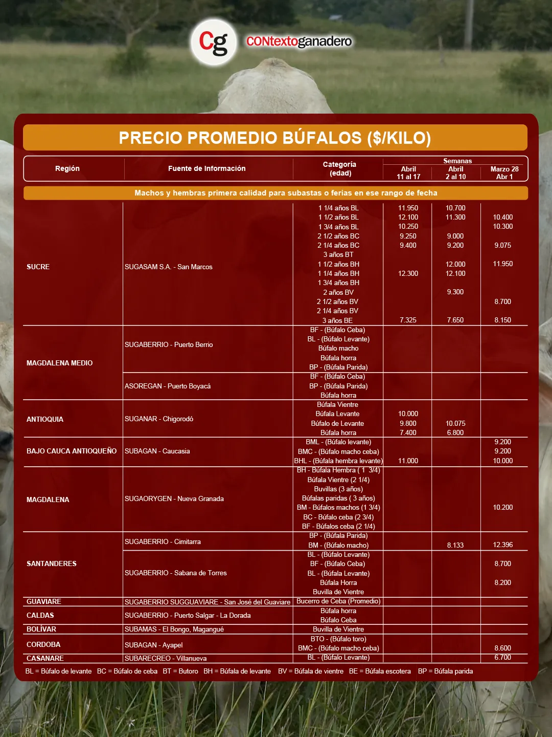El mercado bufalino mostró un crecimiento destacado. Sugasam en San Marcos (Sucre) volvió a liderar con la búfala de levante de 1 ¼ años (BH) con $12.300/kg y el búfalo de levante de 1 ½ años (BL) con $12.100/kg.