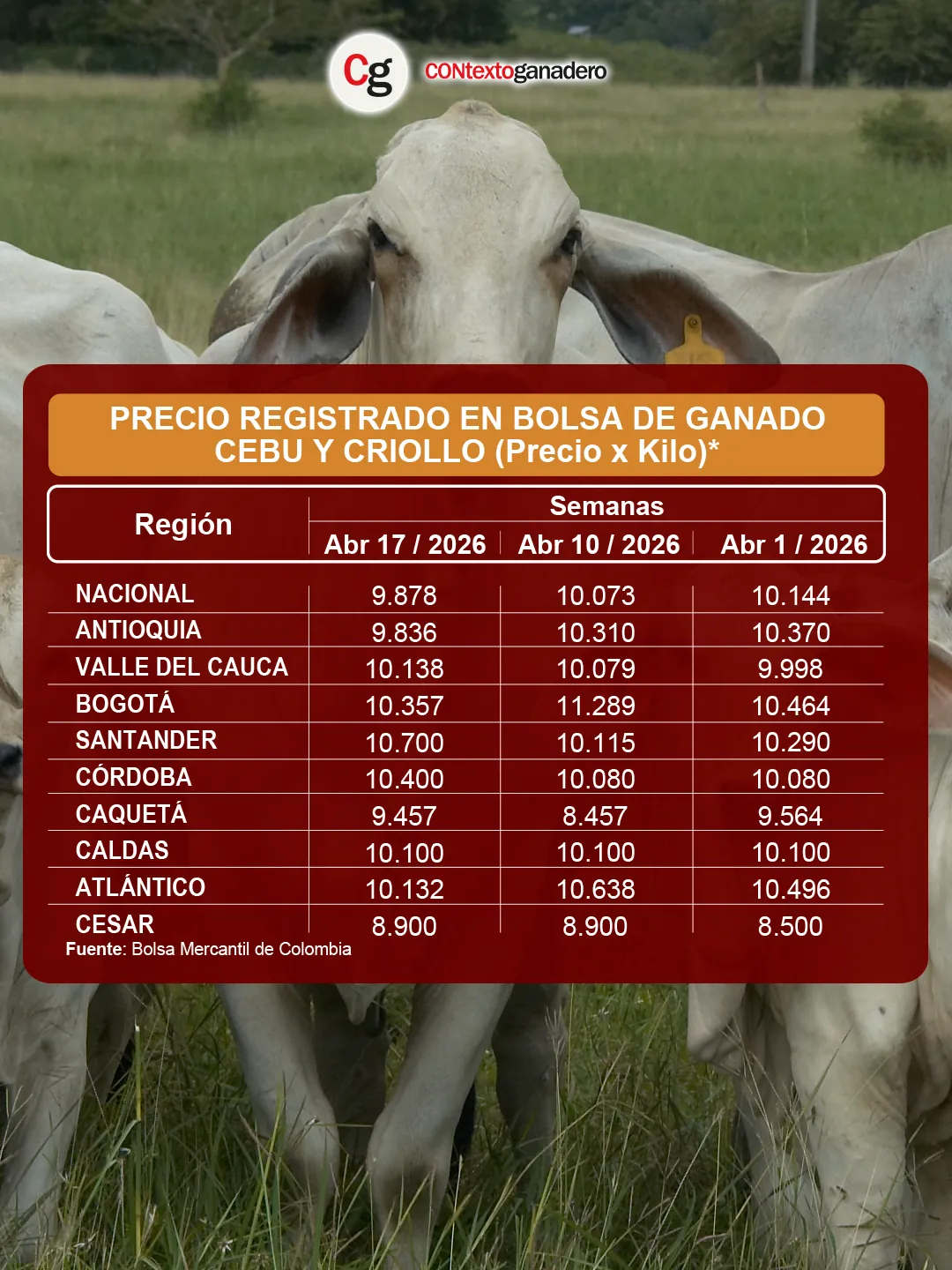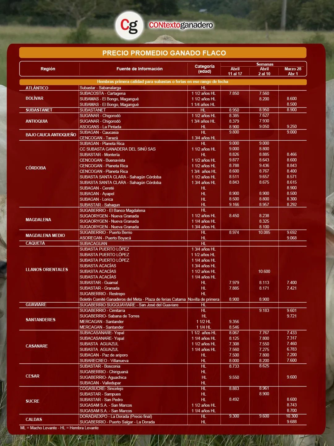 En hembras, Cencogán en Buenavista (Córdoba) lideró con $9.877/kg, seguida por Subagán en Caucasia (Antioquia) con $9.800/kg.