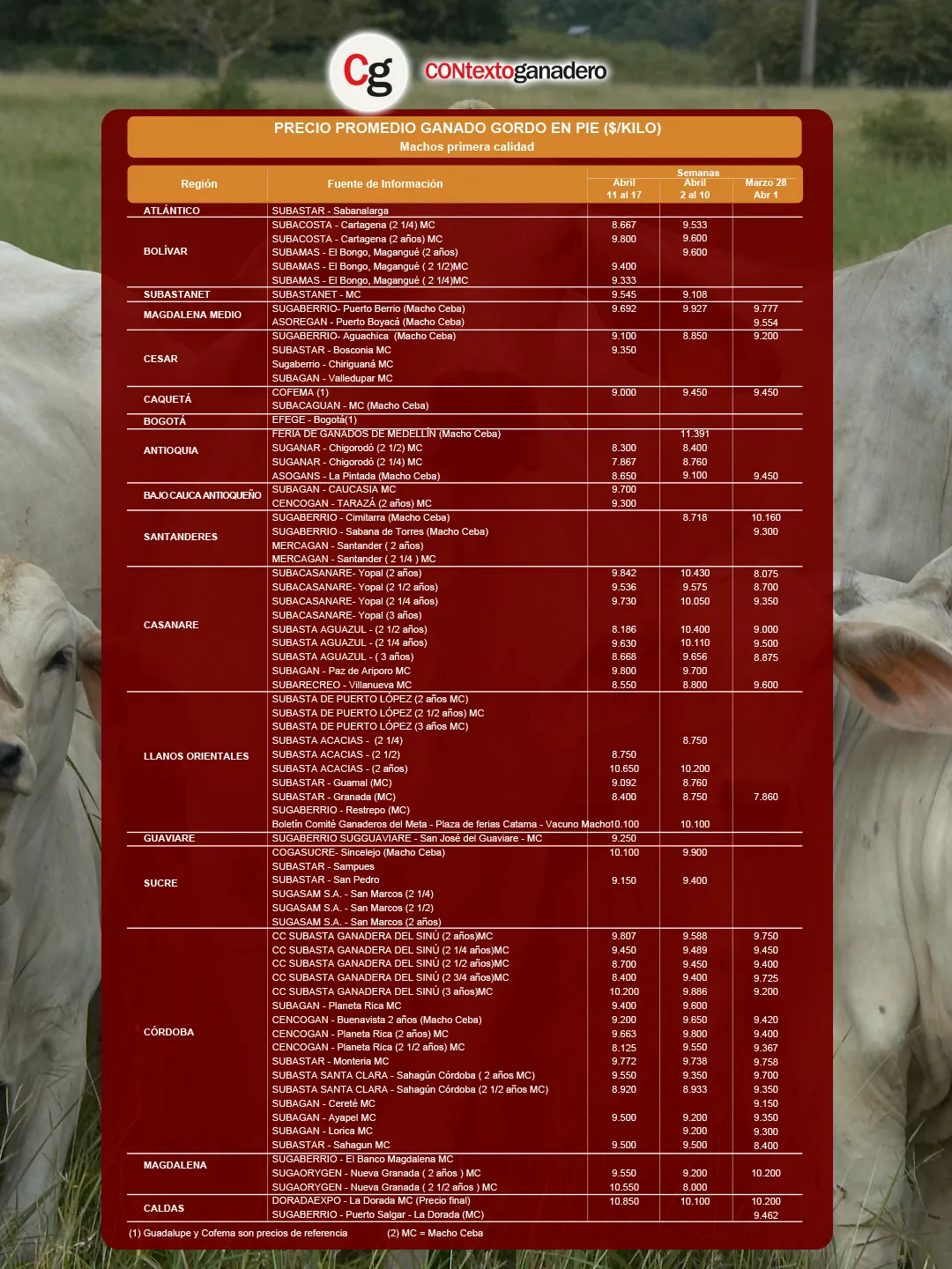 Detrás se ubicaron Doradaexpo en La Dorada (Caldas) con $10.850/kg y Acacías (Meta) con $10.650/kg. Luego aparecieron Sugaorygen en Nueva Granada (Magdalena) con $10.550/kg y la CC Subasta del Sinú en Montería con $10.200/kg.