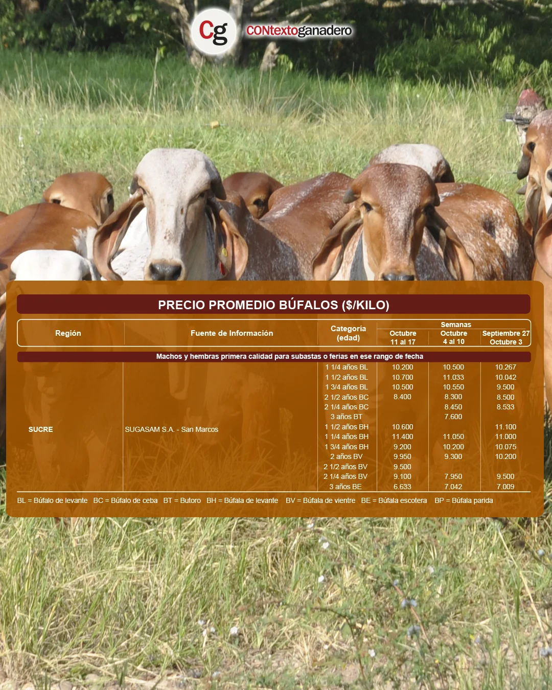 La subasta Sugasam de San Marcos (Sucre), que reporta los precios de la subasta de búfalos que organiza cada martes, informó que los mayores promedios fueron de las búfalas de levante de 1 ¼ años y 1 ½ años, y los machos de levante de 1 ½ años.