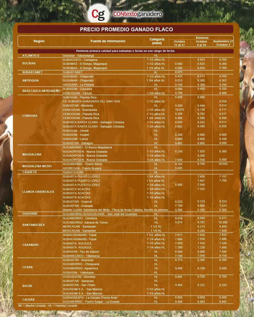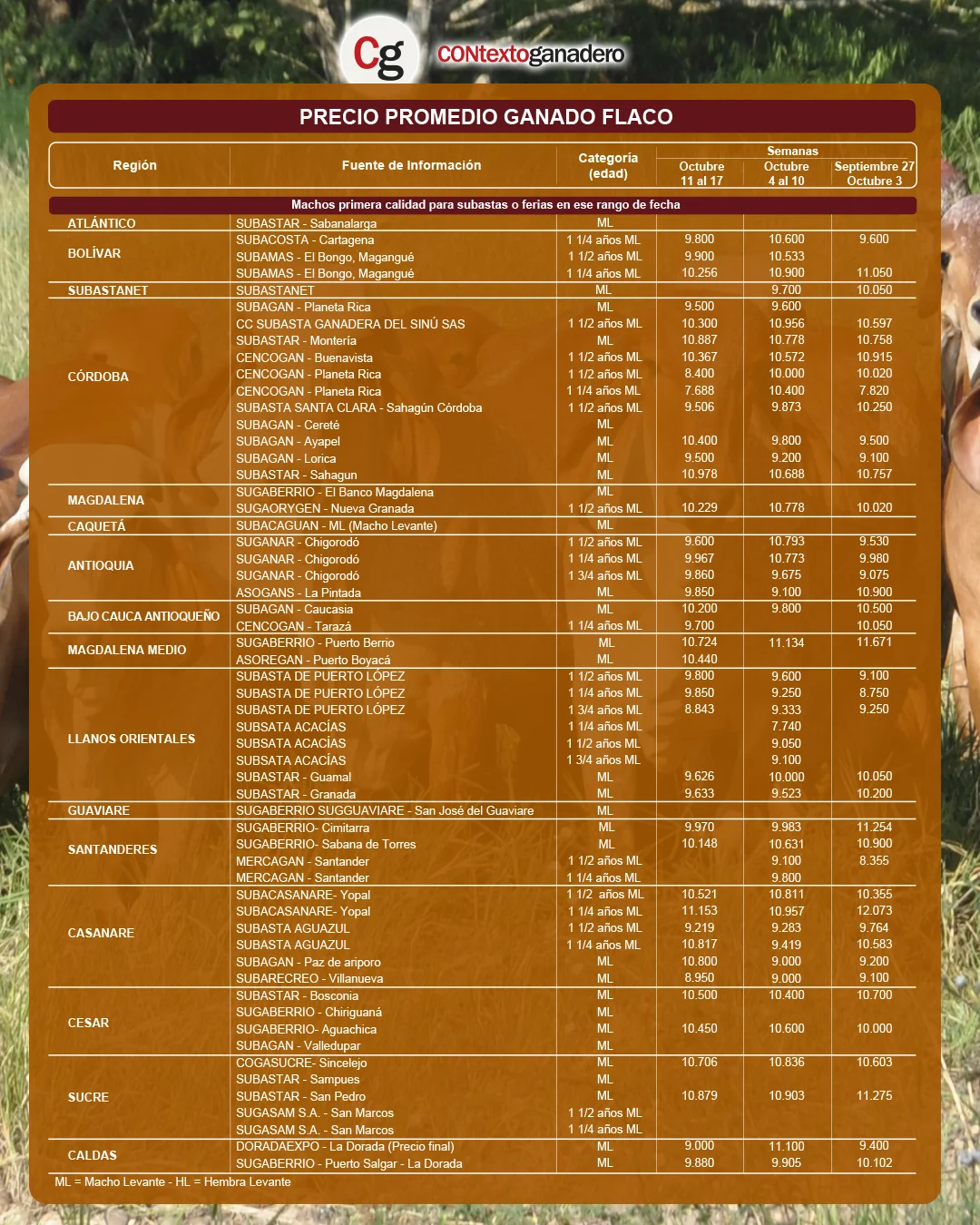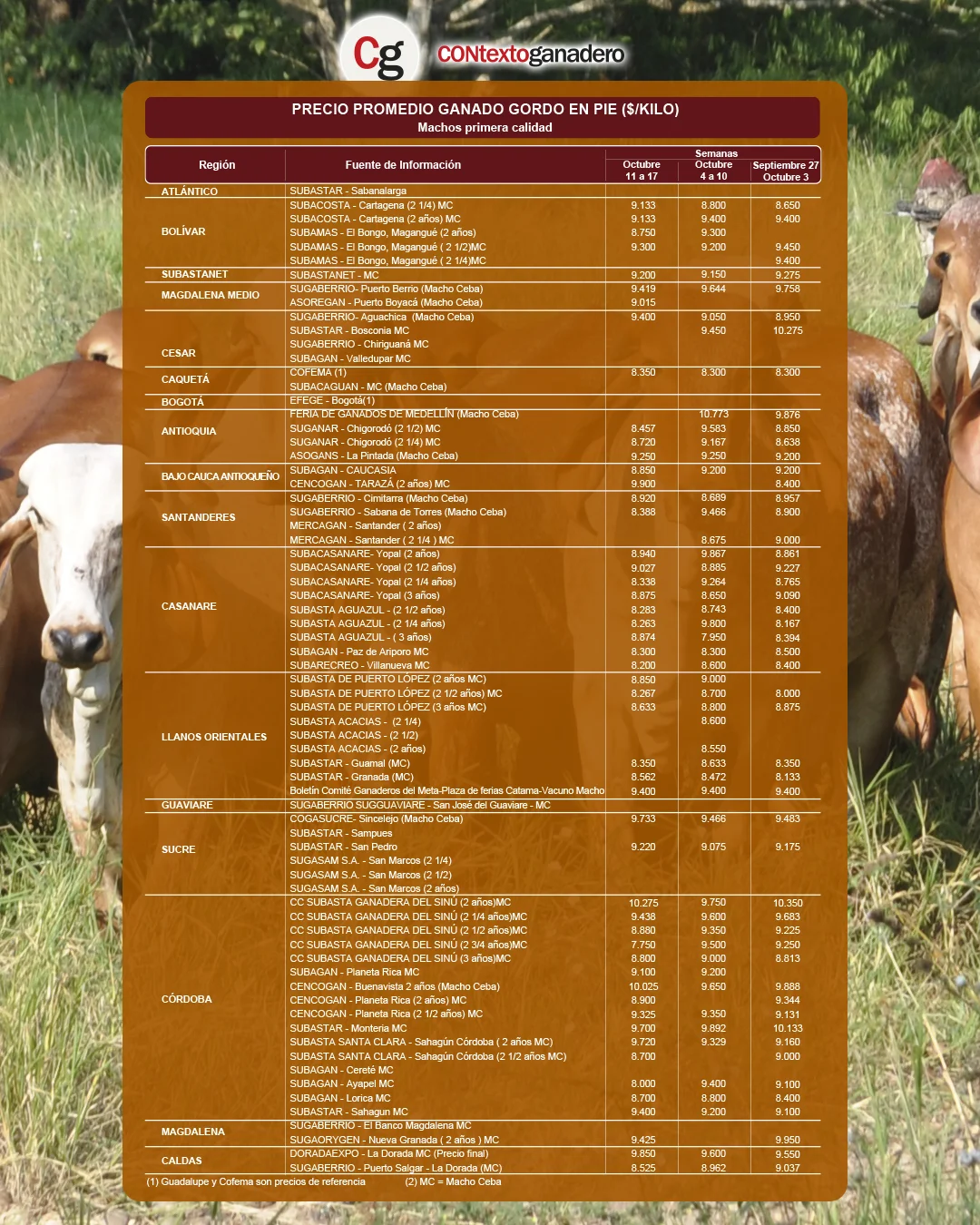 La CC Subasta Ganadera del Sinú en la capital de Córdoba se consolidó como la plaza con el precio más alto del ganado cebado, mientras en la de Casanare lideró el ranking del macho flaco con más de $11.000 por kilo. En hembras, Cencogán volvió a destacar con el mejor promedio nacional, y la Bolsa Mercantil reportó bajas a nivel nacional.