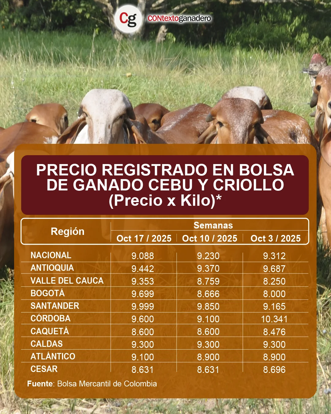 En cuanto al reporte del precio del ganado gordo en la Bolsa Mercantil de Colombia, el departamento de Santander repitió el primer lugar con $9.999/kg.
