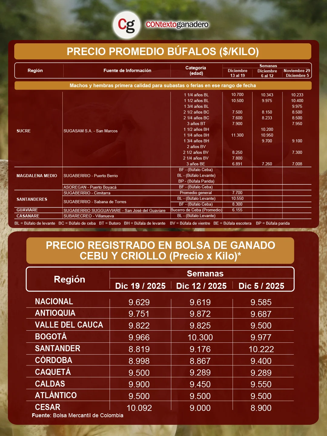 En el cierre del año se suman nuevas subastas de búfalos a las 4 que ya están incluidas en el informe. Para esta ocasión se añadieron al reporte Sugaberrío de Cimitarra y Sabana de Torres (Santander) con categorías como búfalo de levante (BL) y Búfalo de ceba (BF), y Sugguaviare y Sugaberrío en San José del Guaviare con bucerro de ceba.