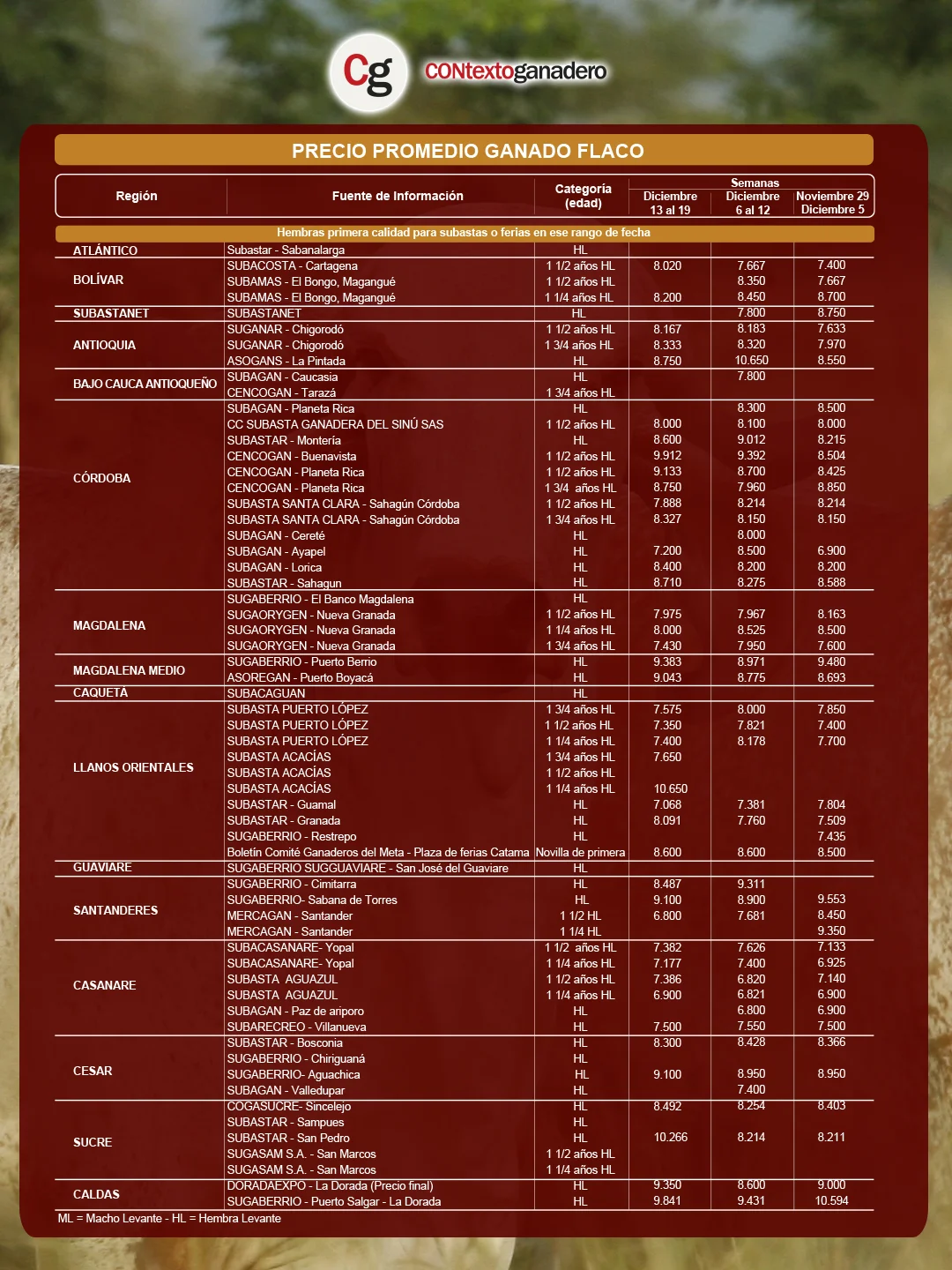 A diferencia de los dos anteriores, el promedio nacional de la hembra de levante creció, subiendo 0,9 % o $77 para llegar a $8.302/kg. (Lea en CONtexto ganadero: Estas son las subastas que empiezan el último mes del 2025 con los mejores precios del ganado)