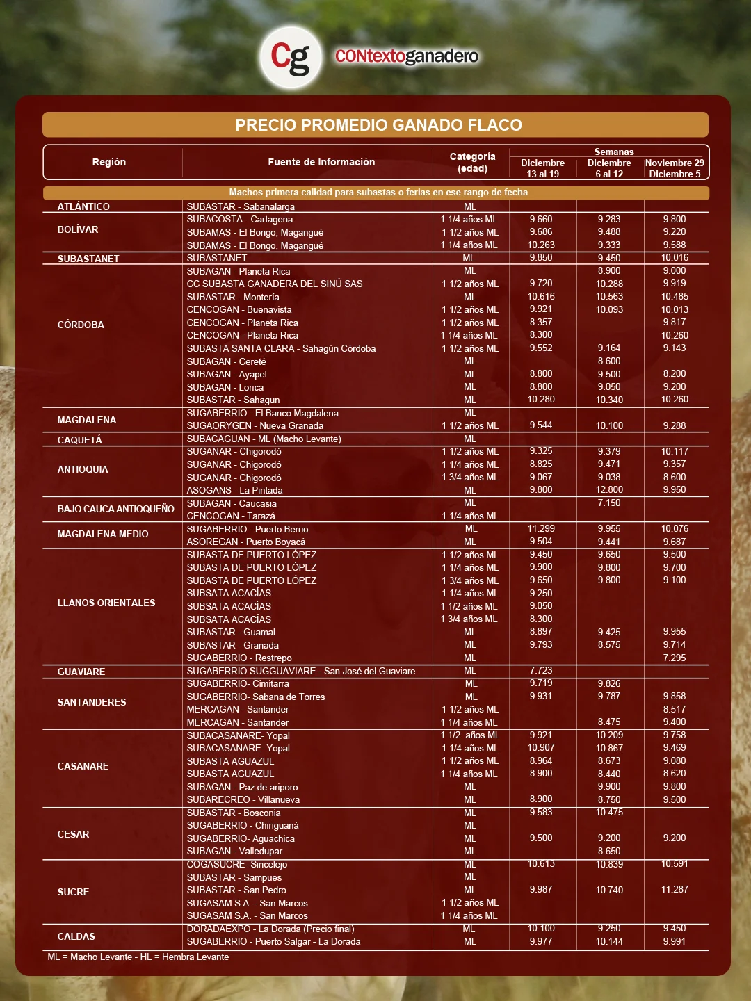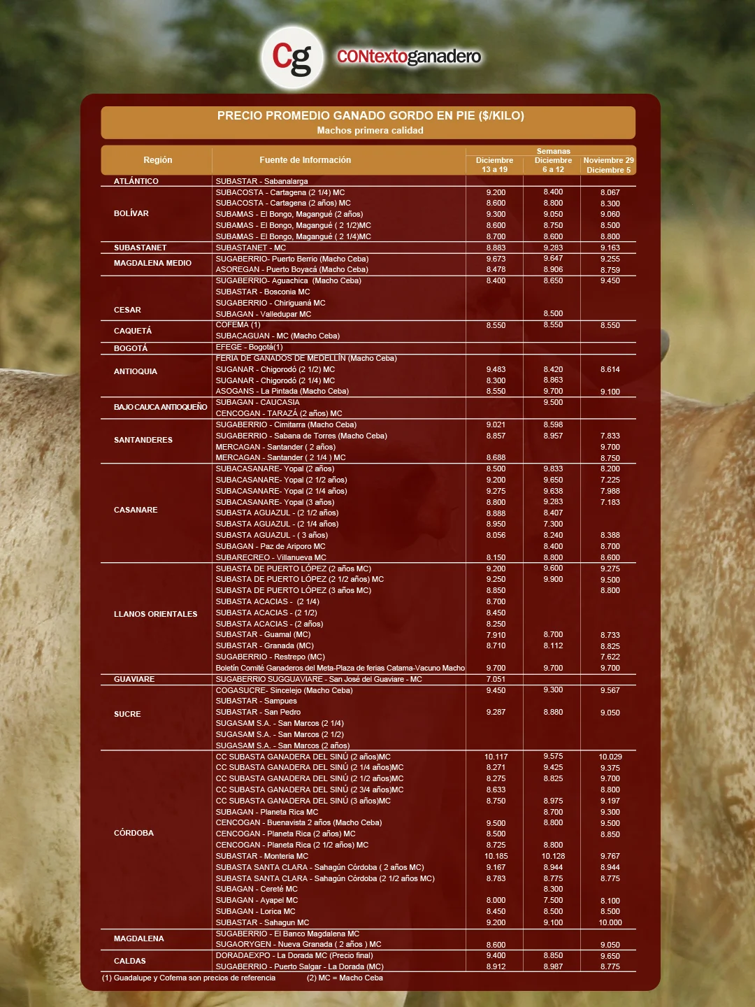 A continuación, CONtexto ganadero presenta las principales novedades del precio del ganado en subastas de la semana del 13 al 19 de diciembre, con base en los datos recopilados por la Oficina de Planeación y Estudios Económicos de la Federación Colombiana de Ganaderos y el Fondo Nacional del Ganado (Fedegán-FNG).
