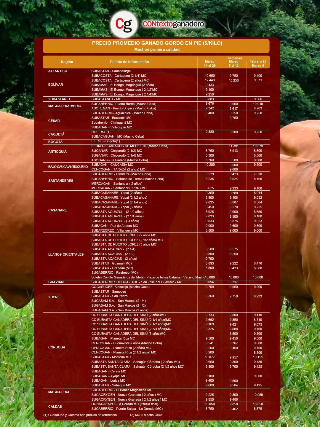 Las siguientes plazas, con valores muy cercanos entre sí, fueron en su orden: Sugaberrío en Cimitarra —líder del reporte anterior— con $9.635/kg; Sugaberrío en Sabana de Torres con $9.597/kg; Sugaberrío en Puerto Berrío con $9.480/kg; y Cencogán en Planeta Rica (Córdoba), con la categoría de 1 ½ años en $9.329/kg.