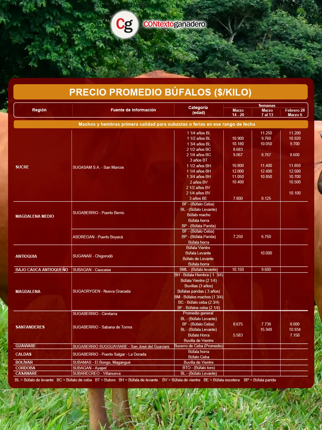 Como es recurrente, Sugasam, en San Marcos (Sucre), concentró los promedios más altos en la comercialización de búfalos. La categoría mejor cotizada fue la búfala de levante (BH) de 1 ¼ años, con $12.000/kg.