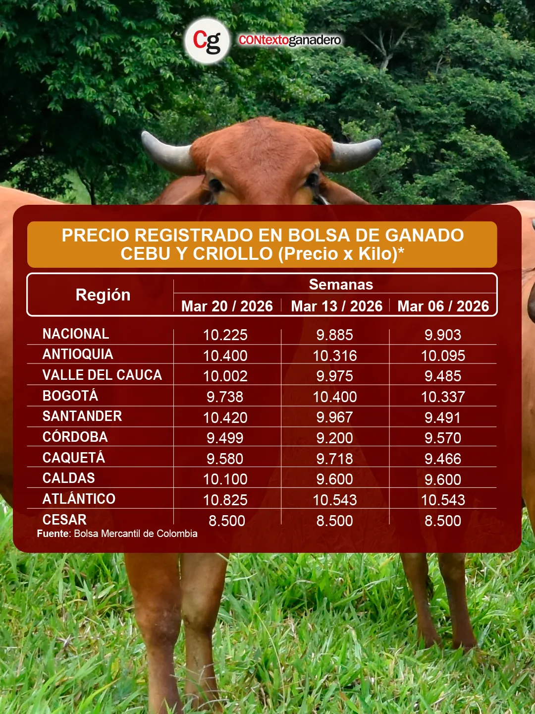 La Bolsa Mercantil de Colombia, en su informe sobre el precio del ganado gordo comercial, reveló que Atlántico se mantiene por tercera semana consecutiva como la región con el mayor valor del país, al registrar $10.825/kg, lo que representa un incremento de $282 (2,7 %) frente a la semana anterior.