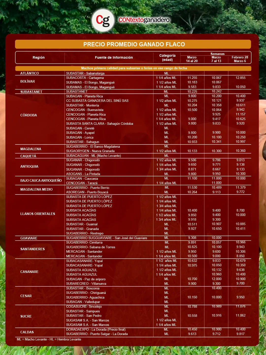 En cuanto al macho flaco o de levante de primera calidad (ML), la subasta con el mejor promedio fue Sugaberrío en Puerto Berrío (Antioquia), que se ubicó en $11.530/kg, $470 por encima del valor del líder de la semana anterior.