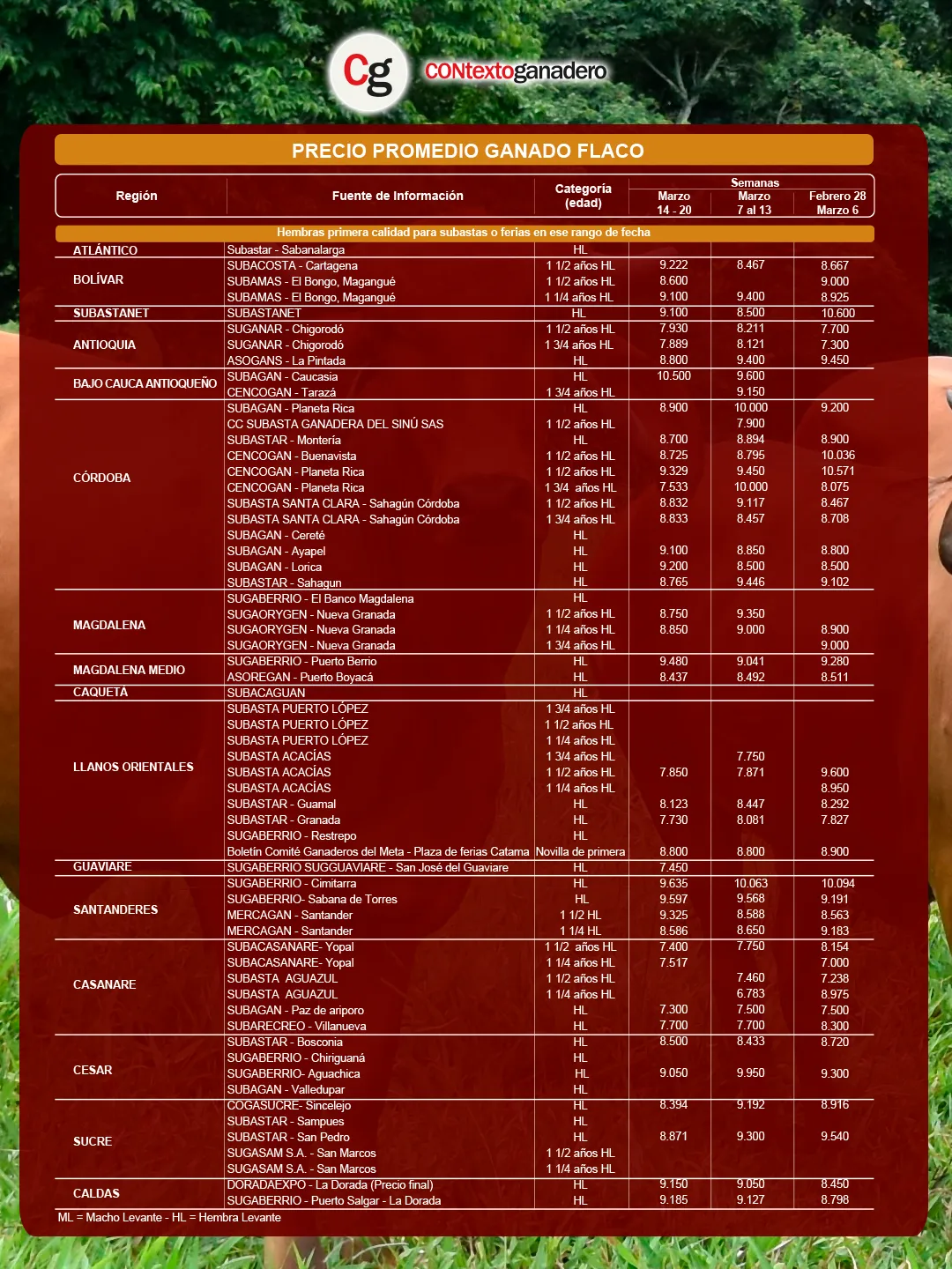 La subasta con el mayor valor de hembra flaca o de levante (HL) fue Subagán en Caucasia, que alcanzó $10.500/kg. Además de ser la única por encima de los $10.000, también registró la mayor variación positiva de la semana, con un alza de 9,4 % ($900).